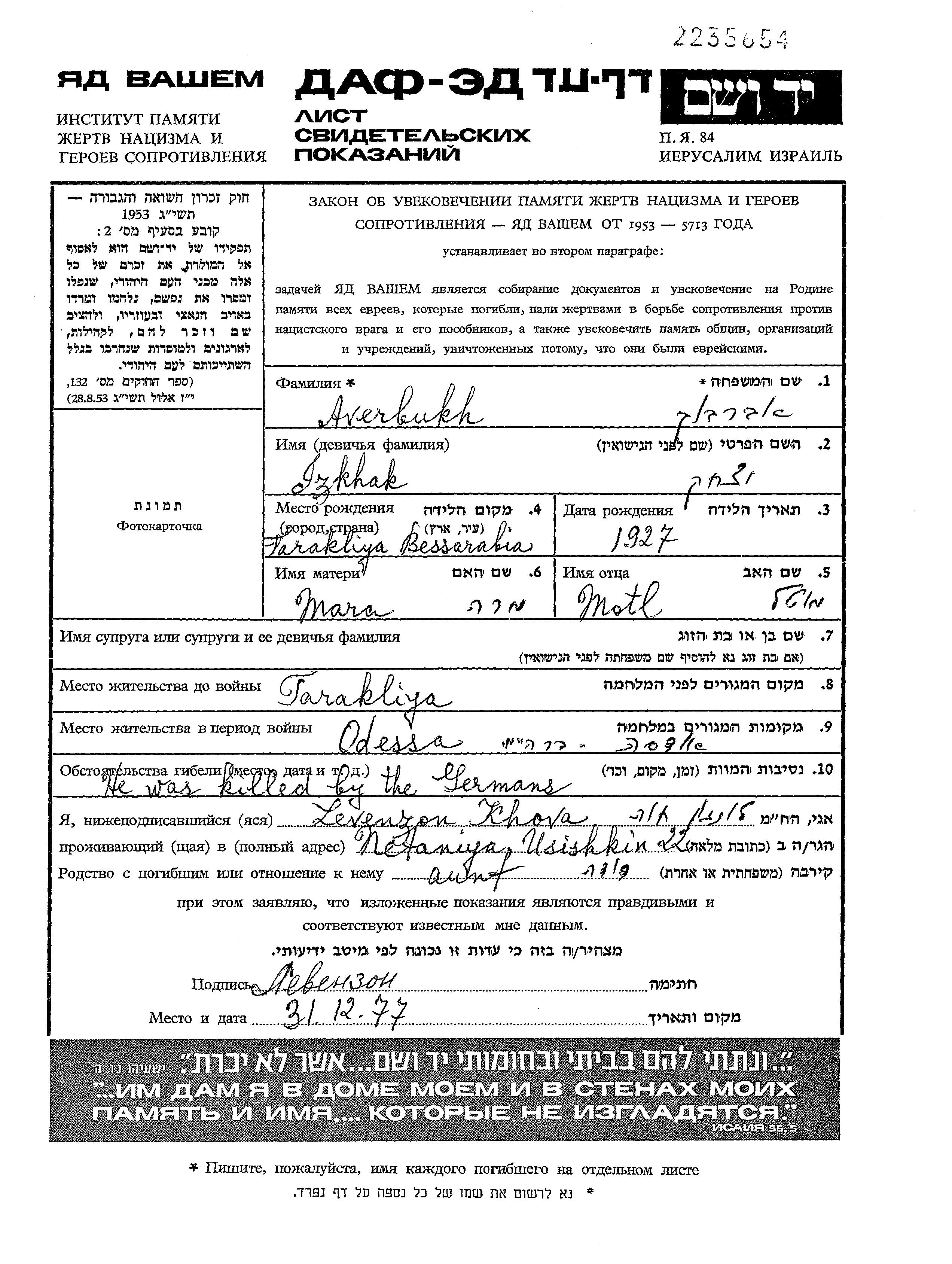 Авербух Ицхак 1927 Тараклия, Румыния Лист свидетельских показаний