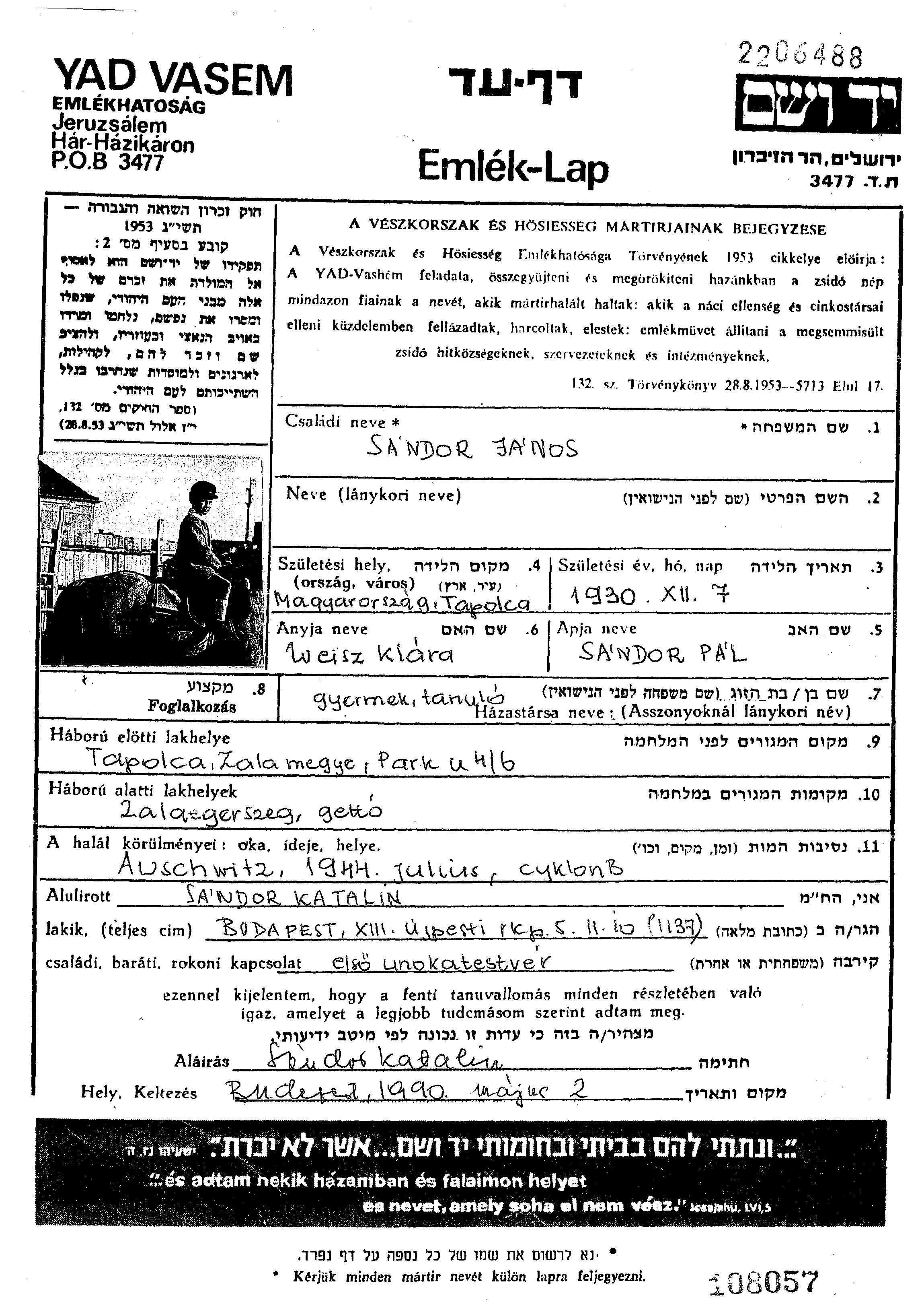 Шандор | Янош | 1930 | Тапольца, Венгрия | Лист свидетельских показаний |