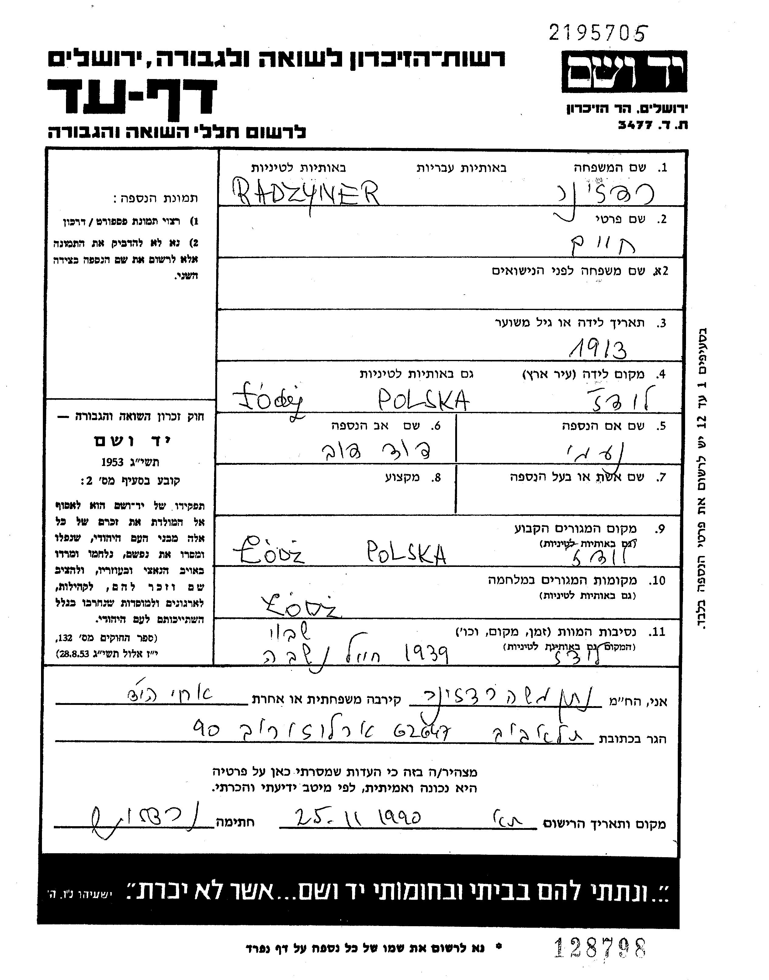 Радзынер Хаим 1913 Лодзь, Польша Лист свидетельских показаний