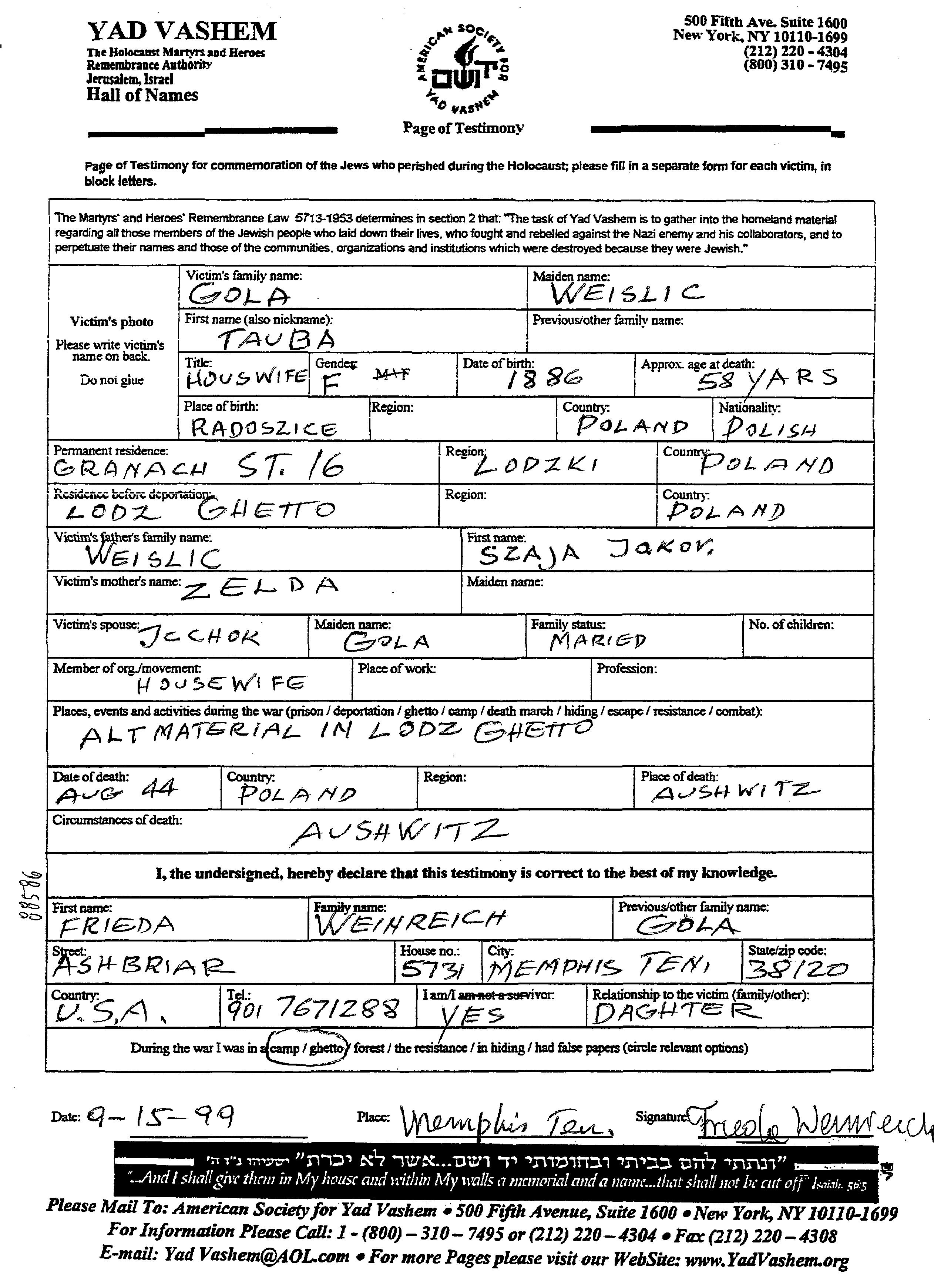 Тауба Гола, девичья фамилия Вейслиц, место рождения: Радошице, Польша. Домохозяйка. Место жительства до войны: Лодзь, Польша.