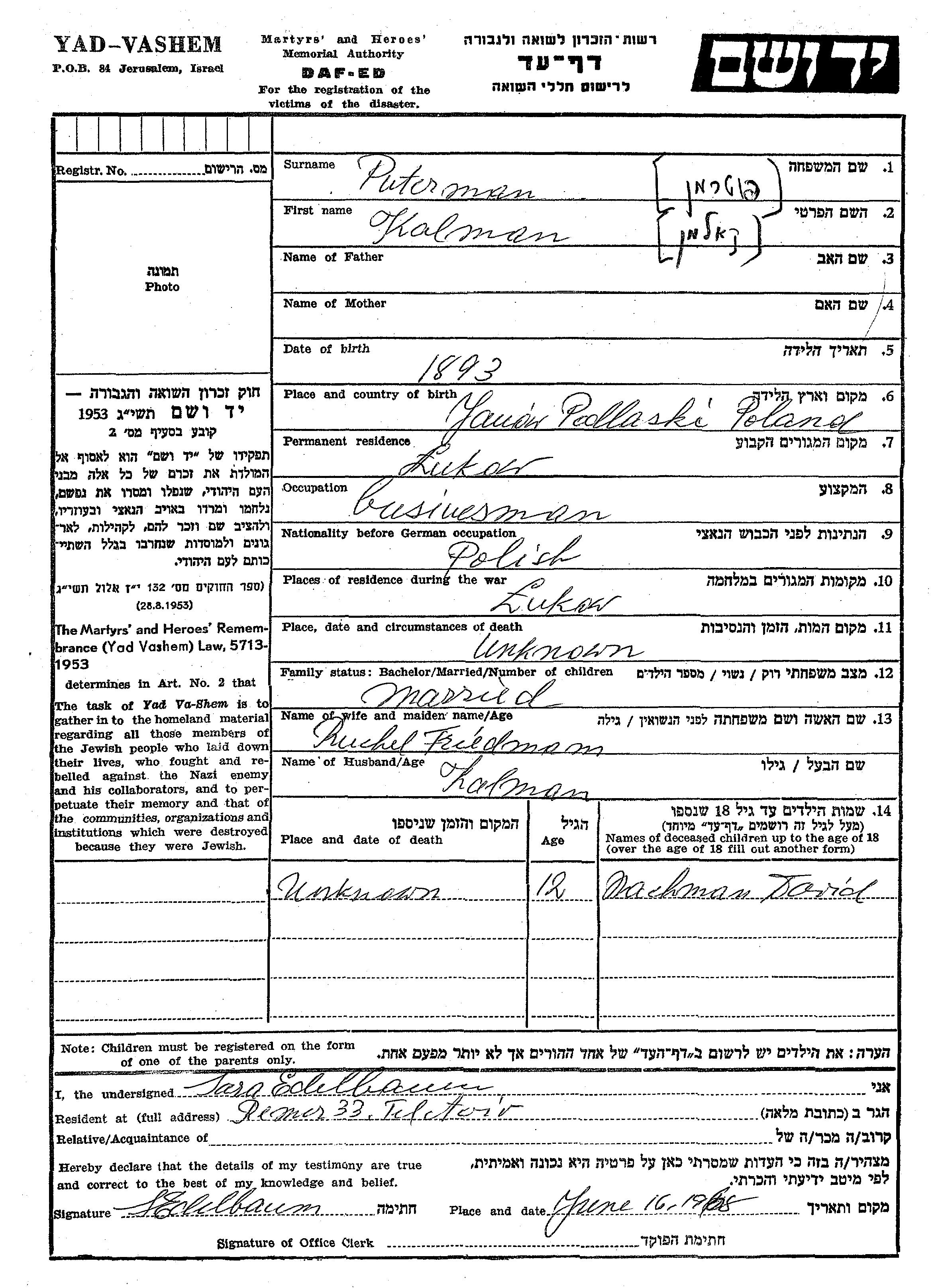 Нахман Давид Путерман Футерман. Место жительства до войны: Лукув, Польша.