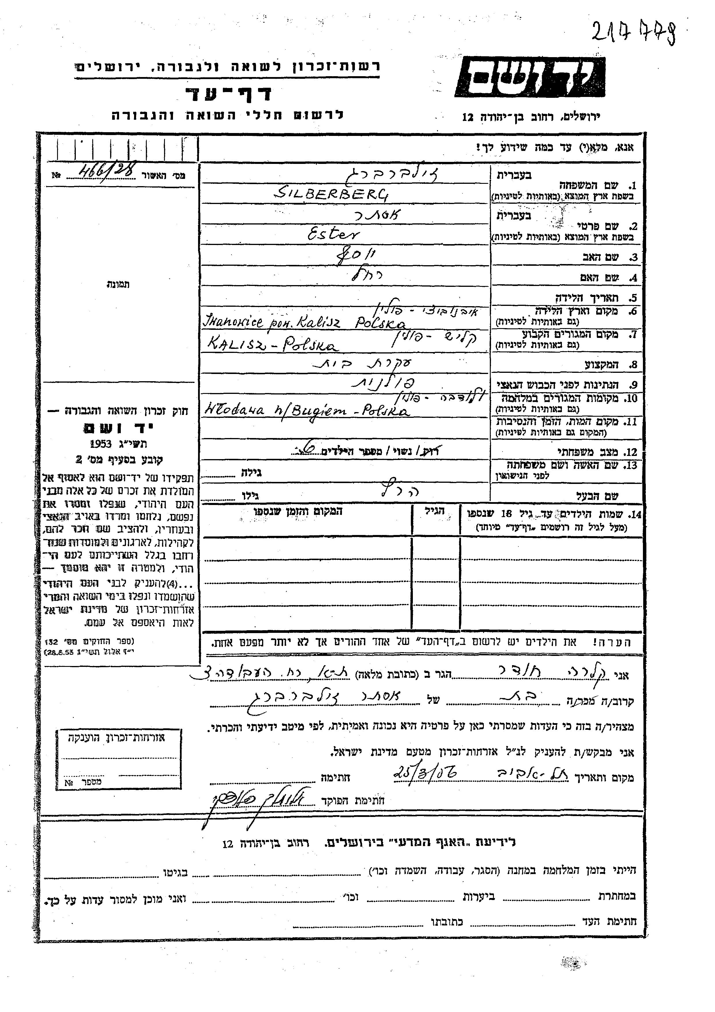 Зильберберг Эстер Калиш, Польша Лист свидетельских показаний