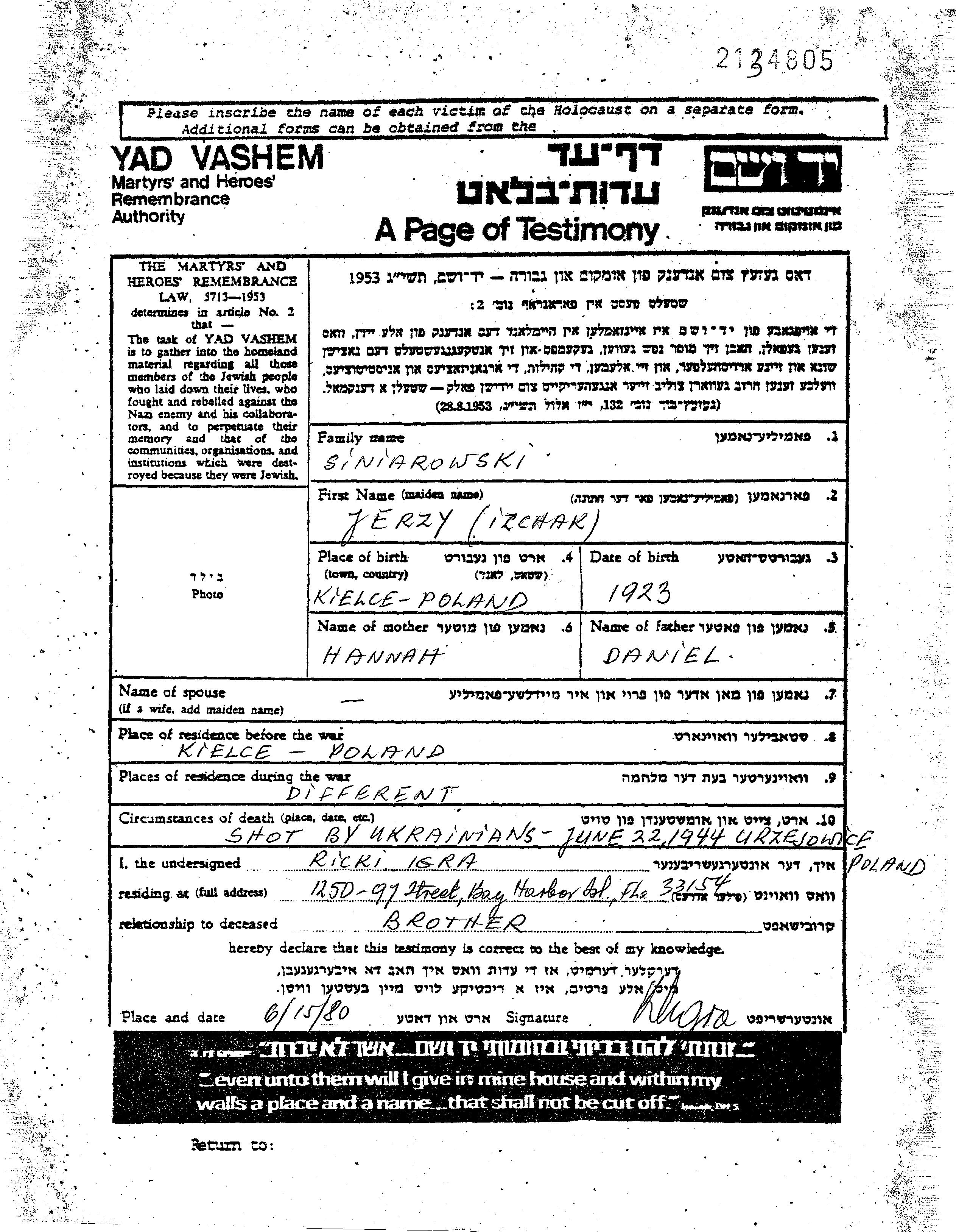 Шиняровски Ежи Ицхак Кельце, Польша Лист свидетельских показаний