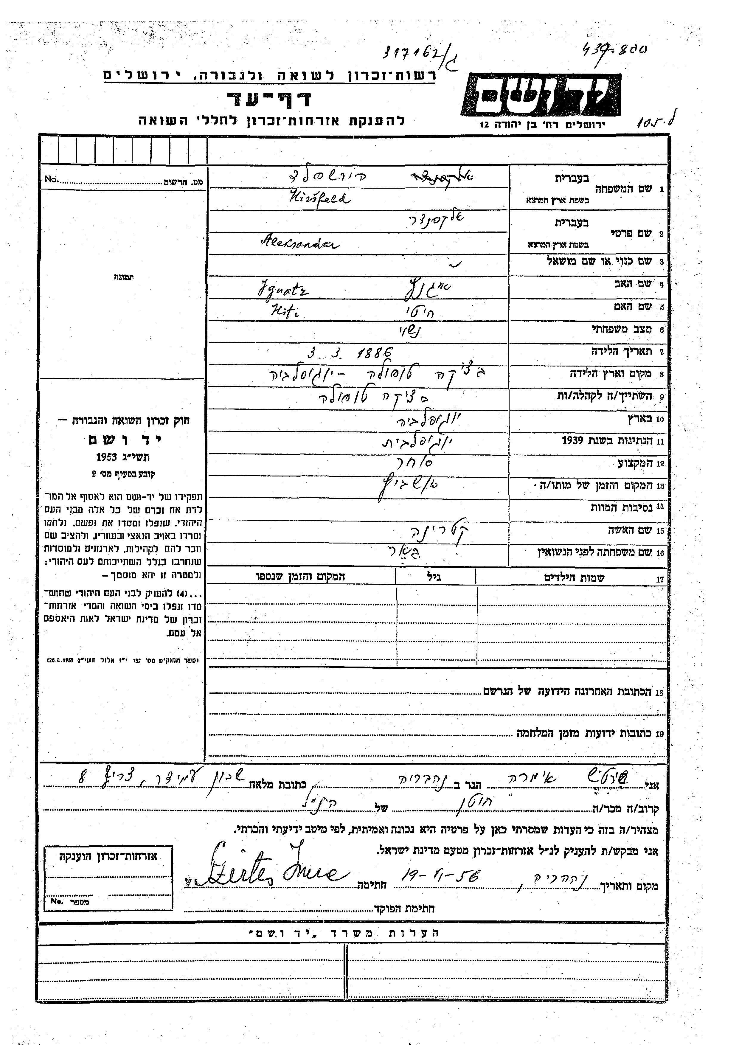 Хиршфельд | Александр | 1886 | Бачка Топола, Югославия | Лист свидетельских показаний |