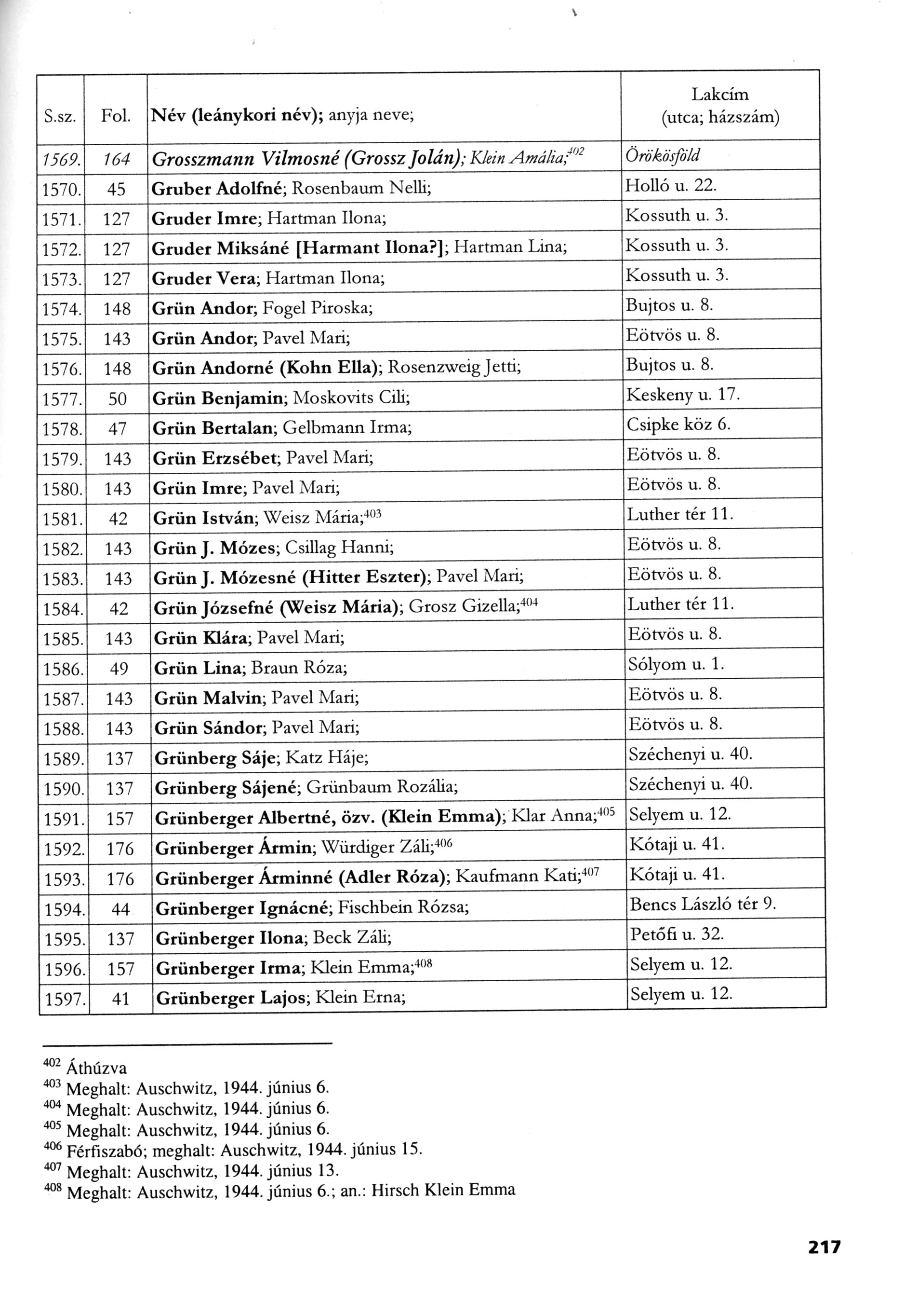 Грюнбергер Роза 1888 Ньиредьхаза, Венгрия Список уничтоженных