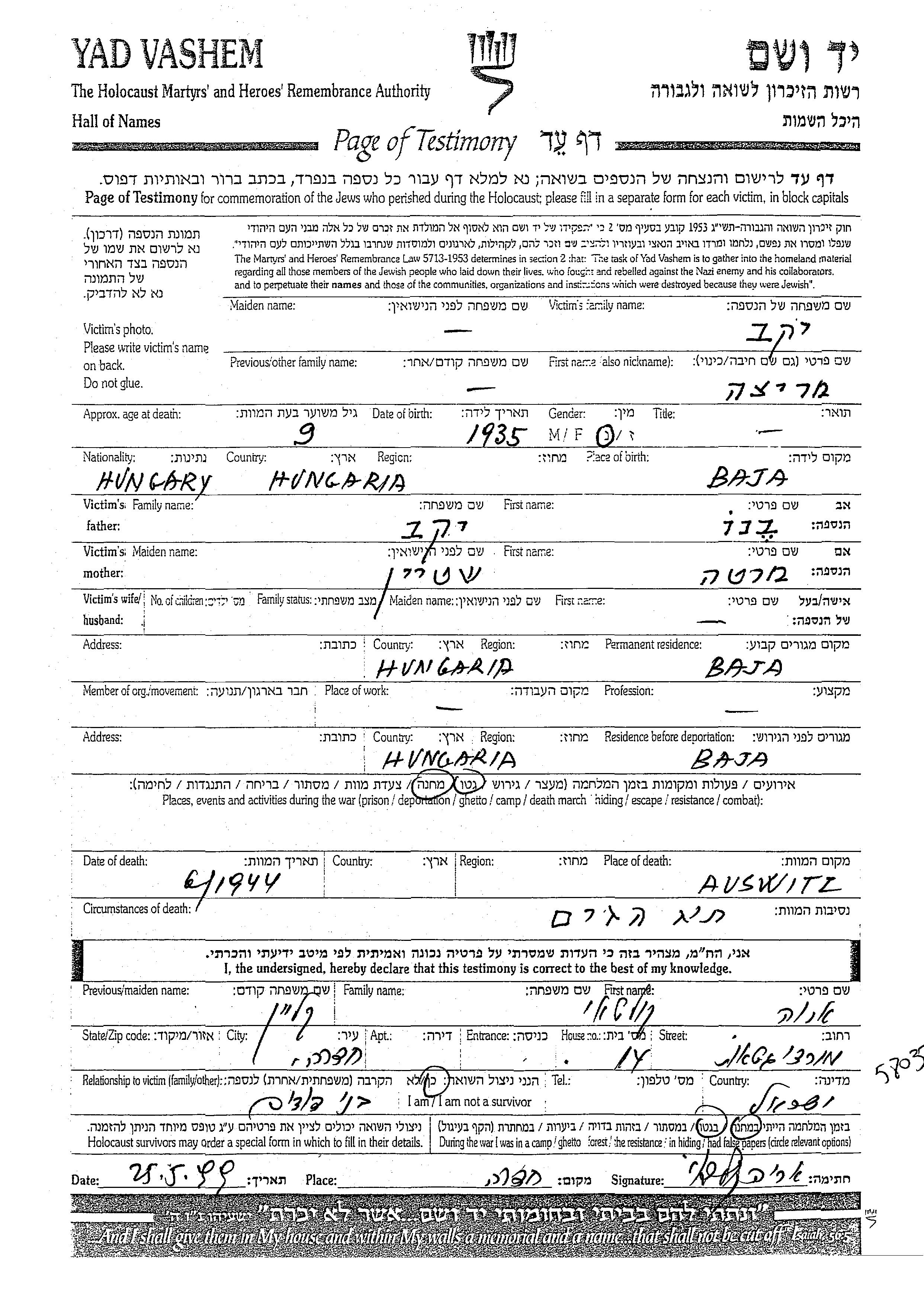 Якаб Мария Вероника 1934 Байа, Венгрия Список уничтоженных