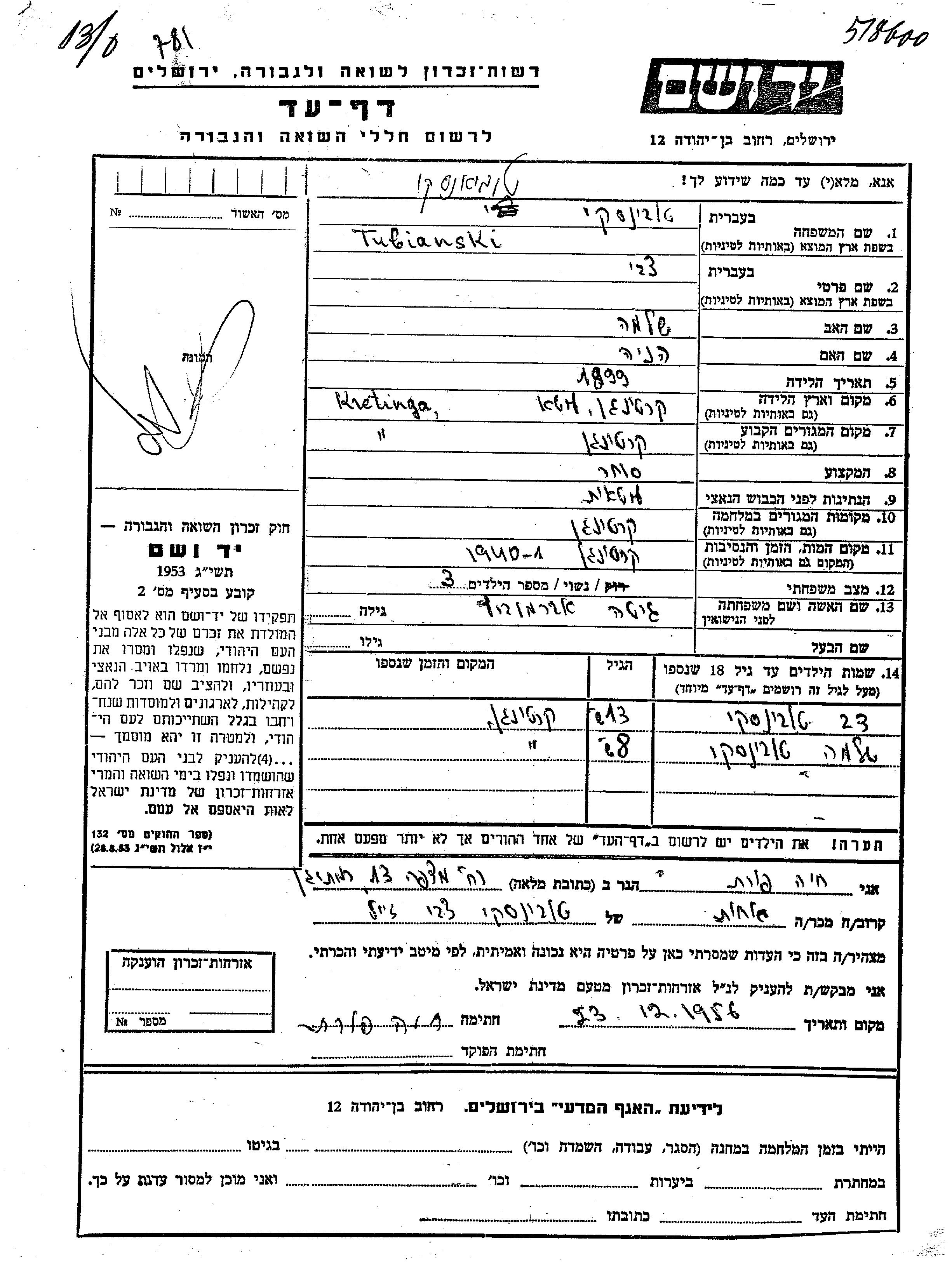 Цви Хирш Тубиански, место рождения: Кретинга, Литва. Торговец / торговка. Место жительства до войны: Кретинга, Литва.
