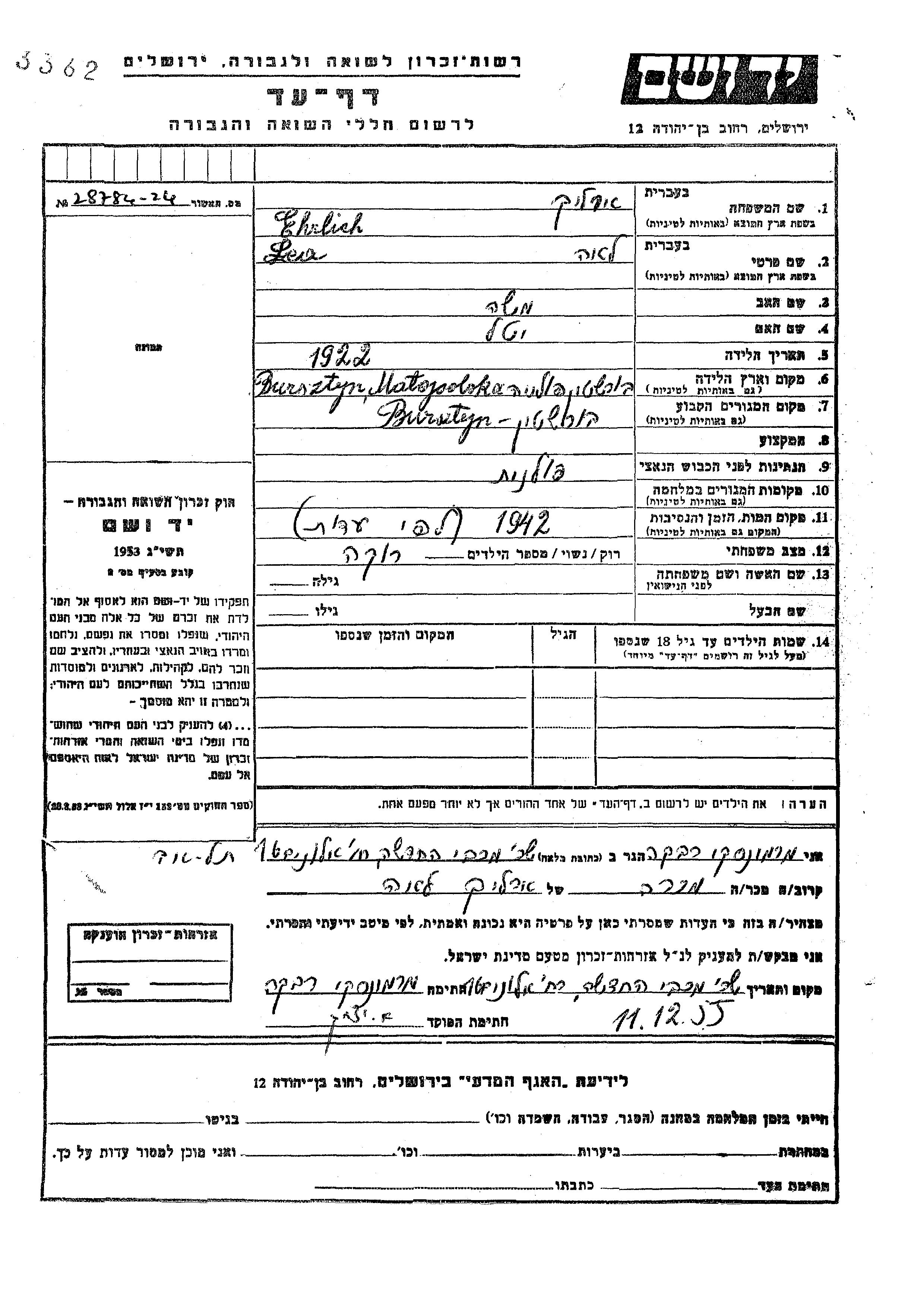 Эрлих Лея 1922 Бурштын, Польша Лист свидетельских показаний