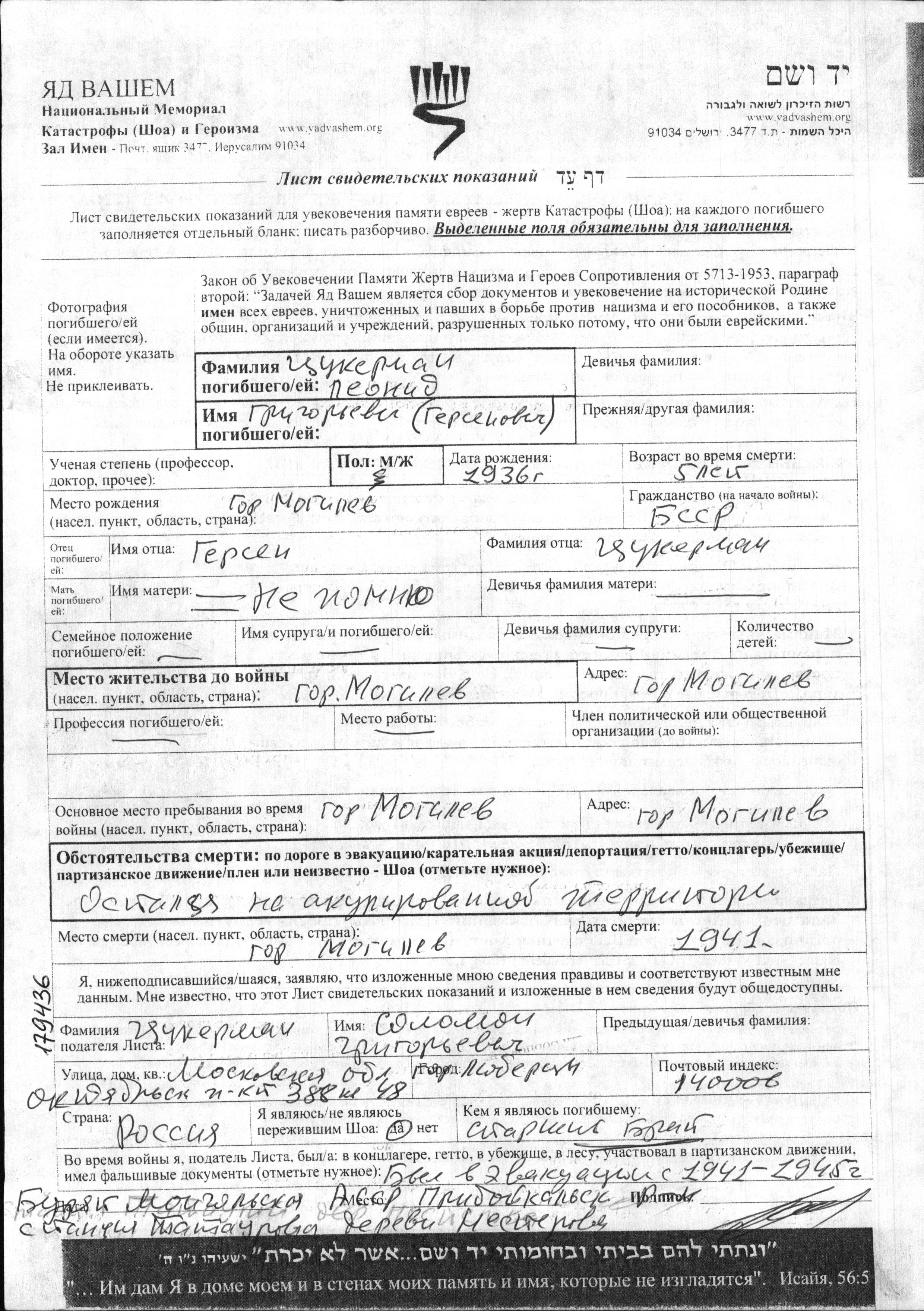 Цукерман Леонид 1936 Могилёв, Белоруссия (СССР) Лист свидетельских показаний