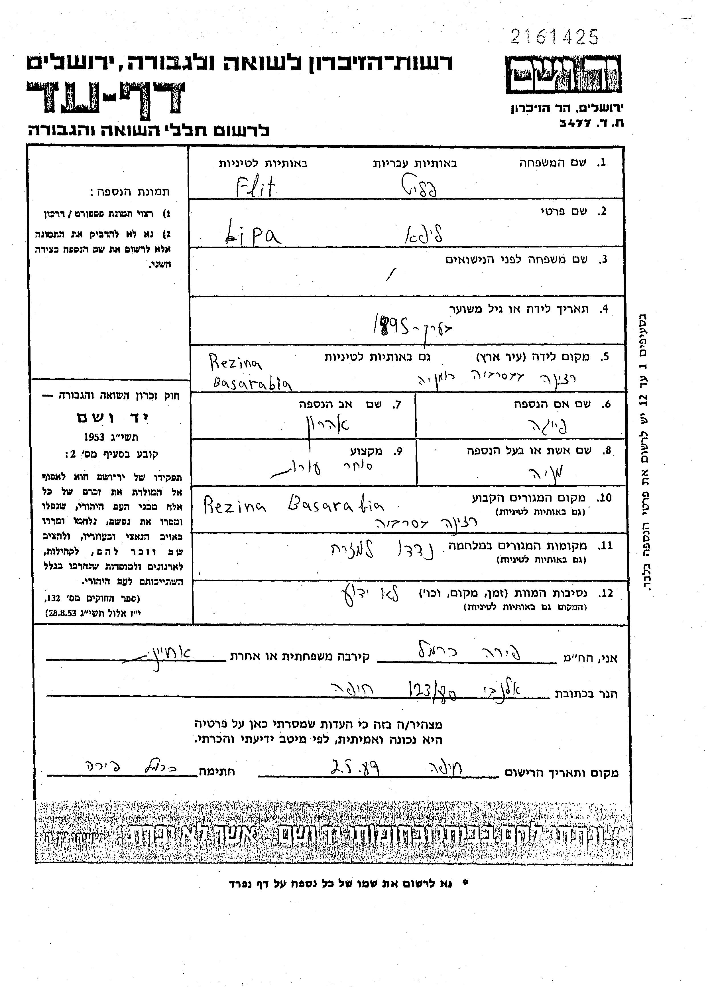 Липа Флитт, место рождения: Резина, Румыния. Торговец кожами. Место жительства до войны: Резина, Румыния.