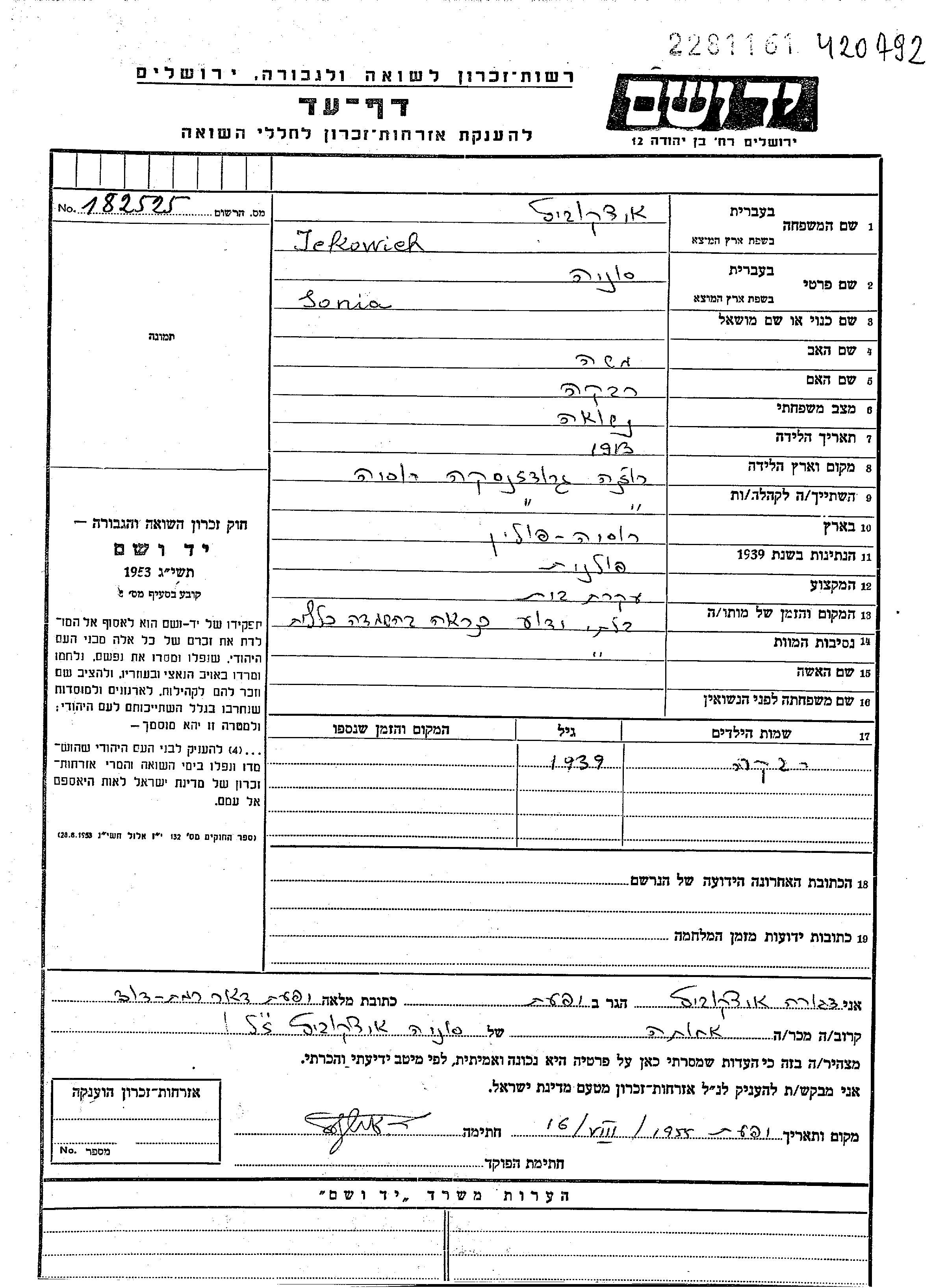 Фамилия неизвестна Соня 1913 Ружаны, Польша Лист свидетельских показаний