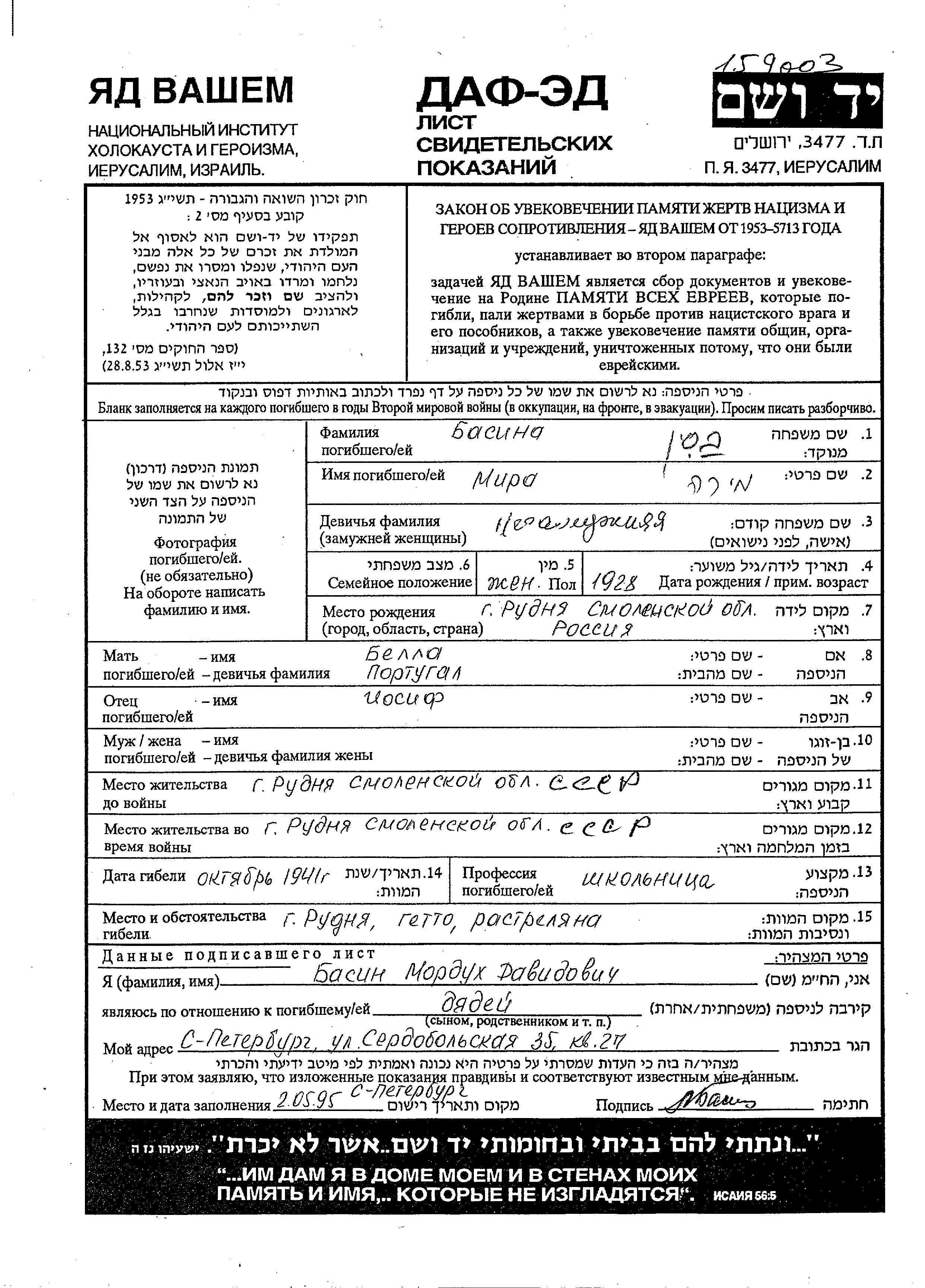 Басин Мира 1924 Рудня, Россия (СССР) Лист свидетельских показаний