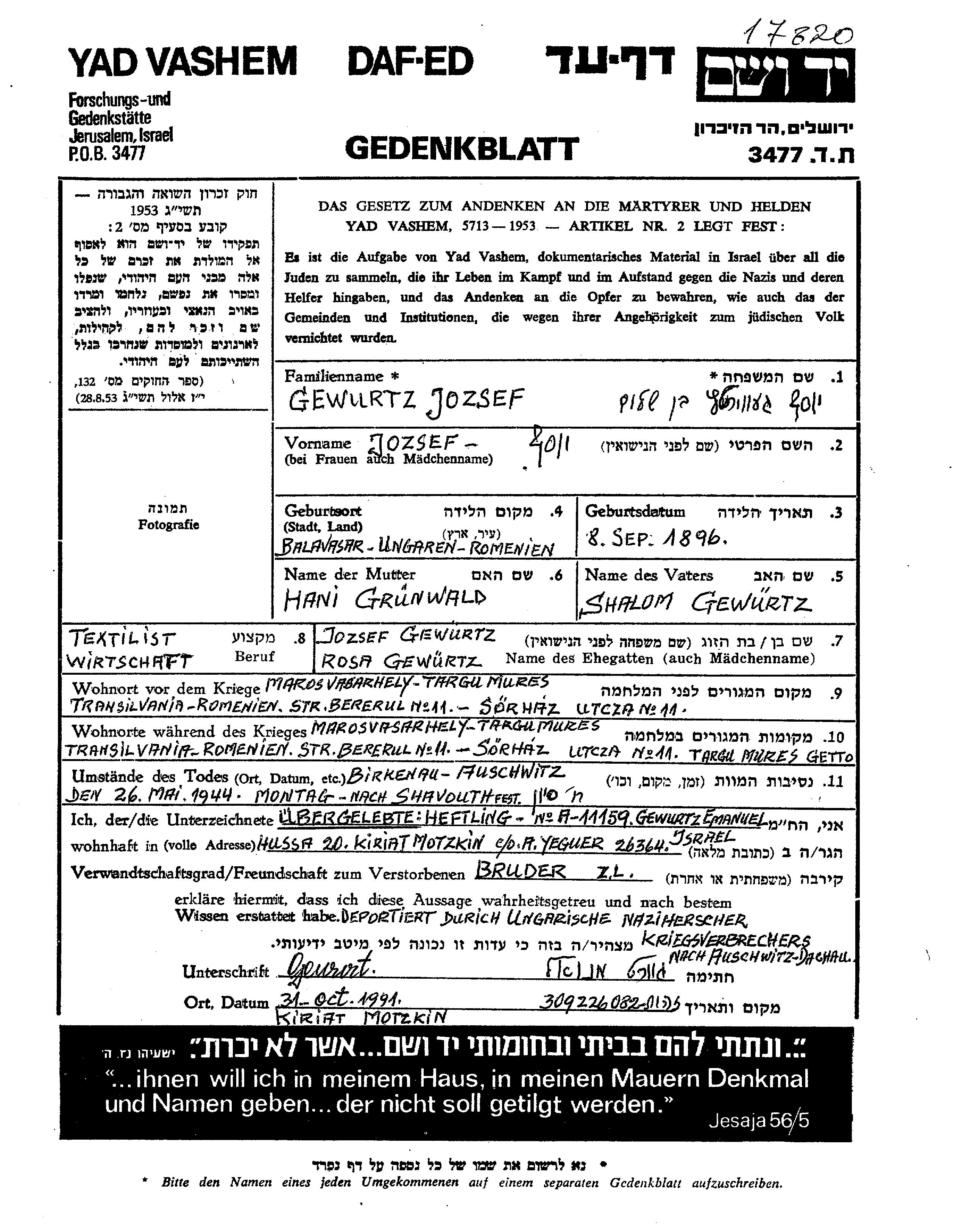 Иосеф Гевурц, место рождения: Балавашар, Румыния. Место жительства до войны: Марошвашархей, Румыния.