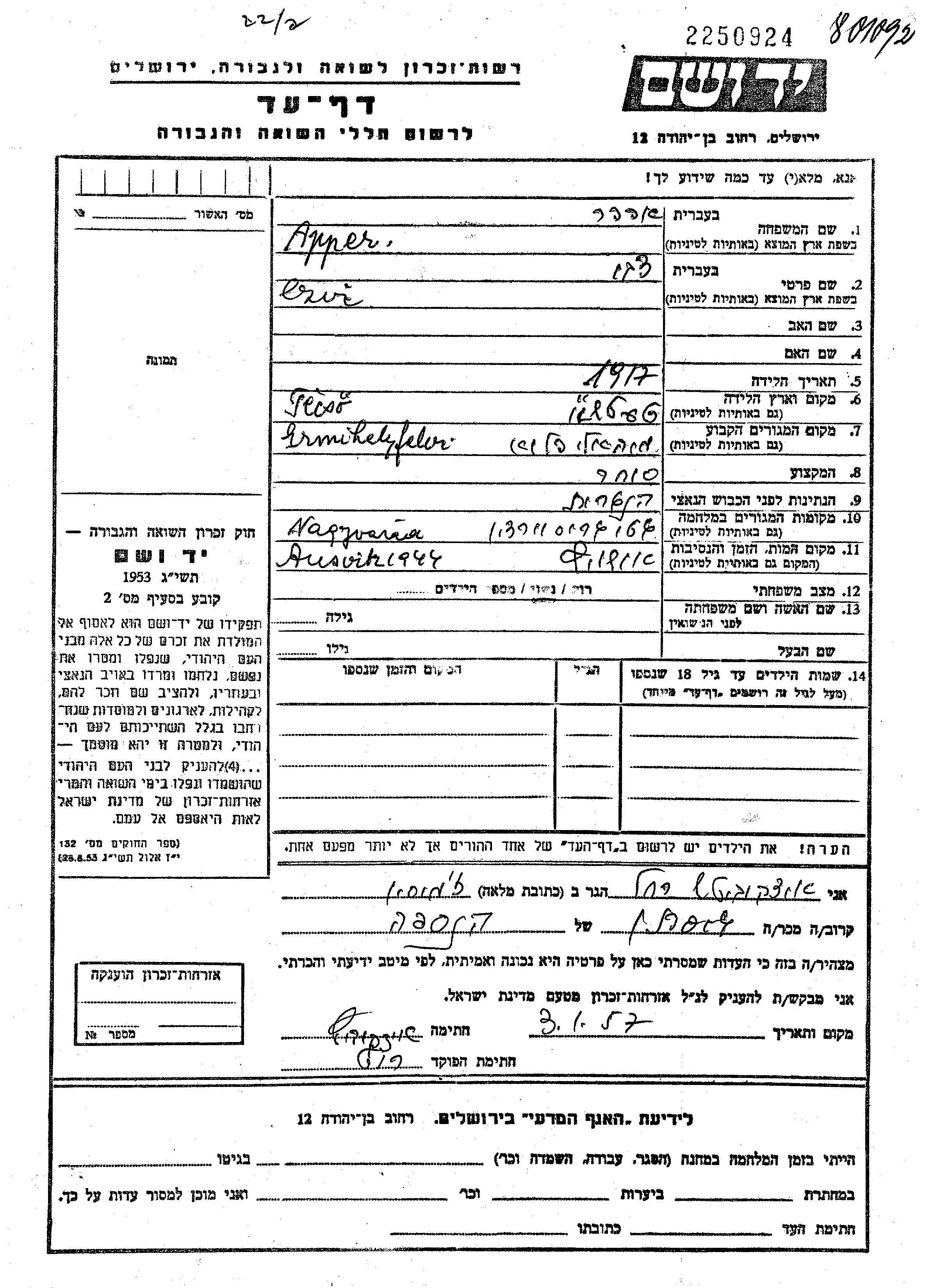 Цви Аппер, место рождения: Течё, Чехословакия. Торговец / торговка. Женат / замужем. Место жительства до войны: Эрмихайфальва, Румыния. Место во время войны: Надьварад, Румыния.