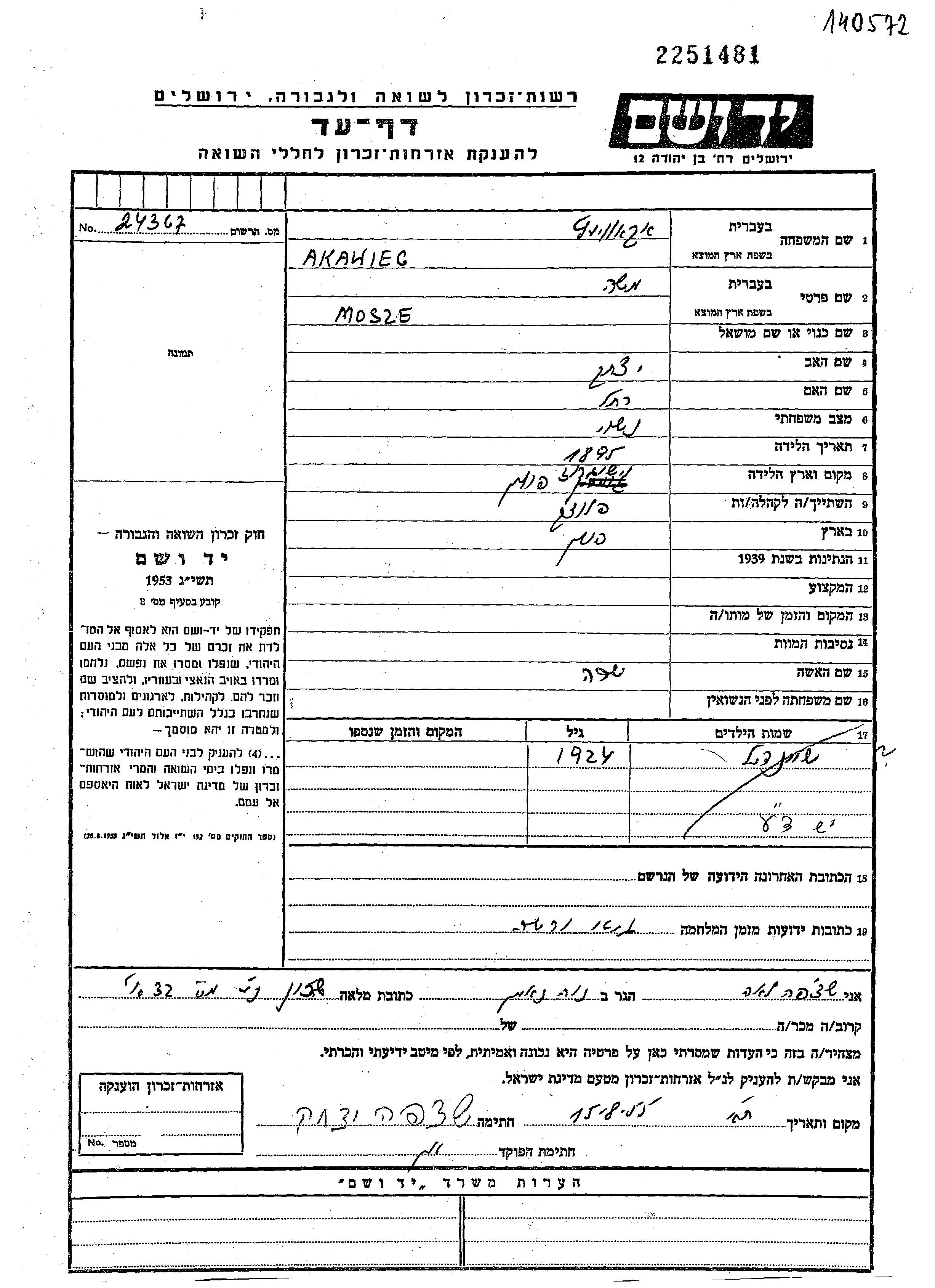 Моше Акавиец, место рождения: Вышогруд, Польша. Отец: Ицхак, mать:Рахель. Женат / замужем. Место жительства до войны: Плоцк, Польша. Место во время войны: Варшава, Польша.