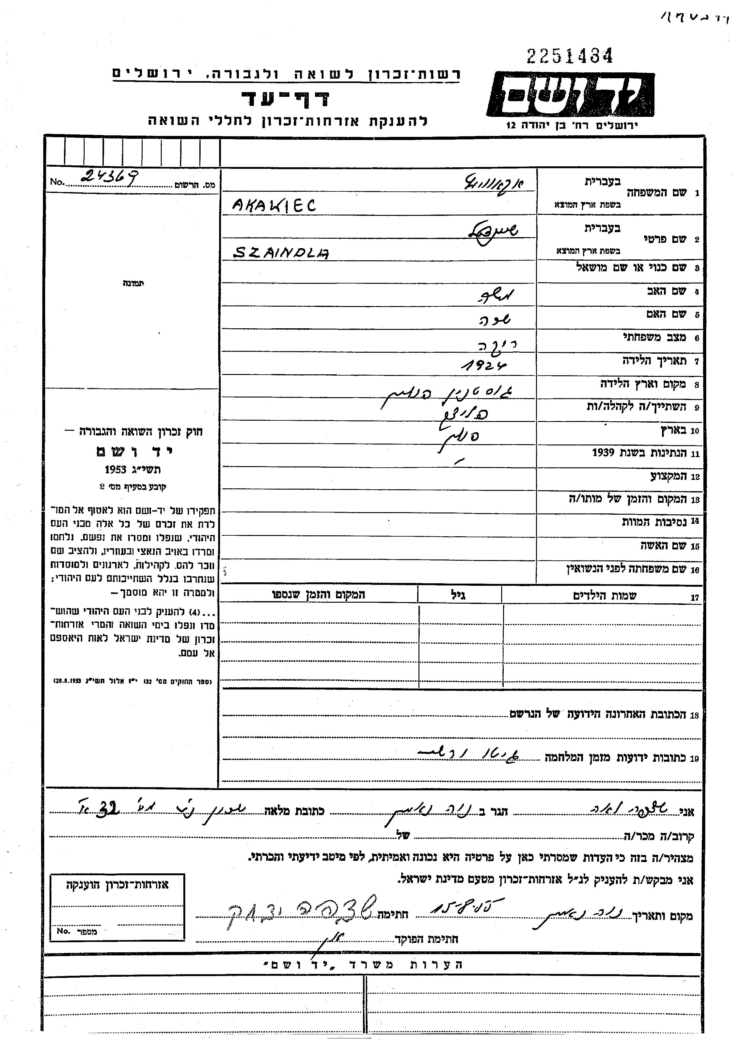 Шайндла Акавиец, место рождения: Гостынин, Польша. Отец: Моше, mать:Сара. Холост / не замужем. Место жительства до войны: Гостынин, Польша. Место во время войны: Варшава, Польша.