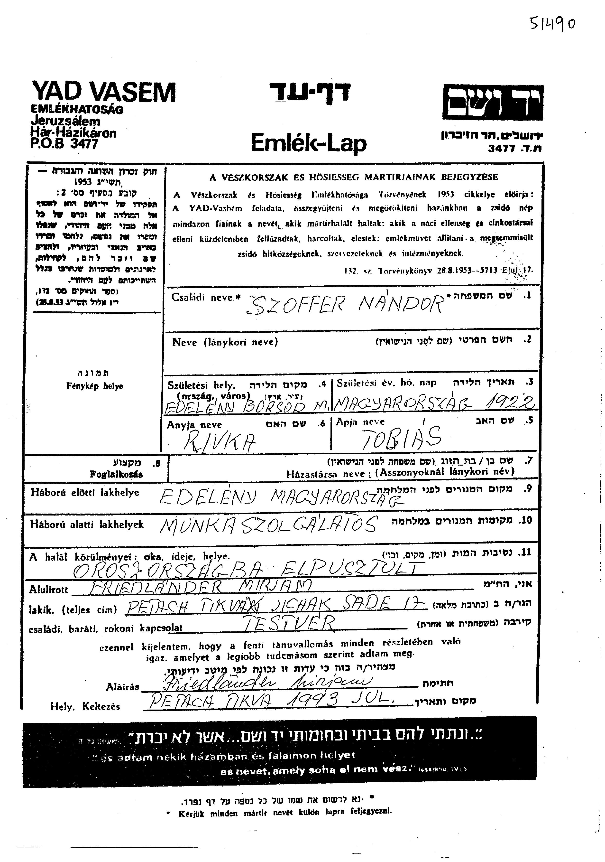 Соффер Нандор Нафтали 1921 Эделень, Венгрия Лист свидетельских показаний