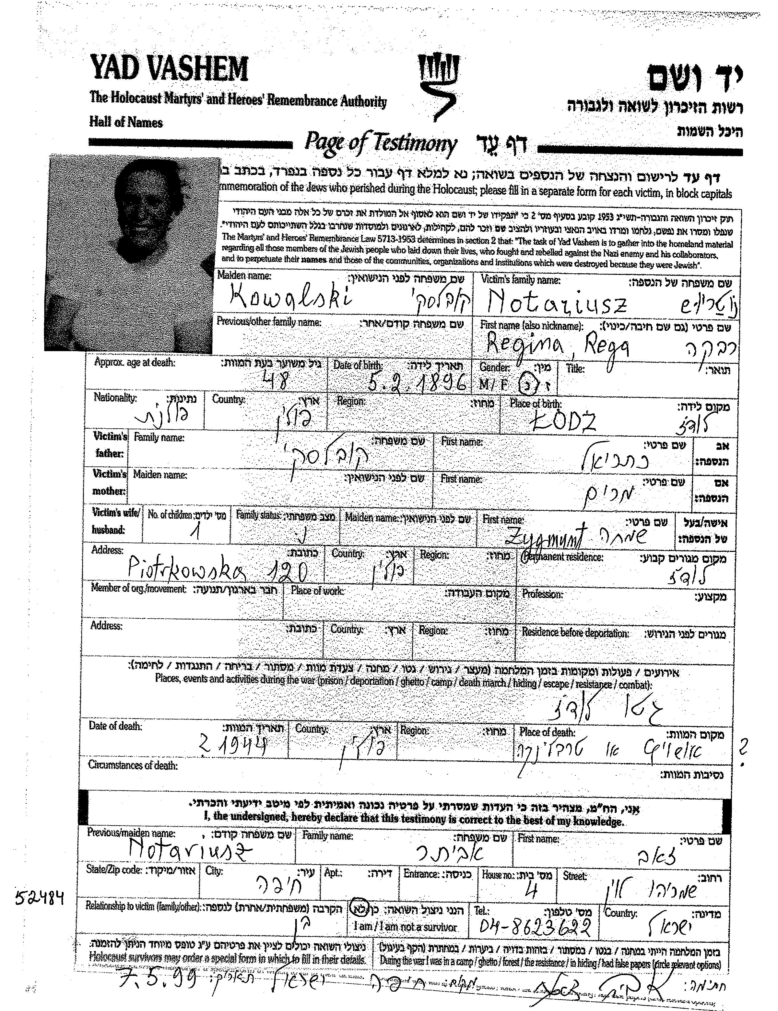 Нотариуш | Регина Ривка | 1896 | Лодзь, Польша | Лист свидетельских показаний |