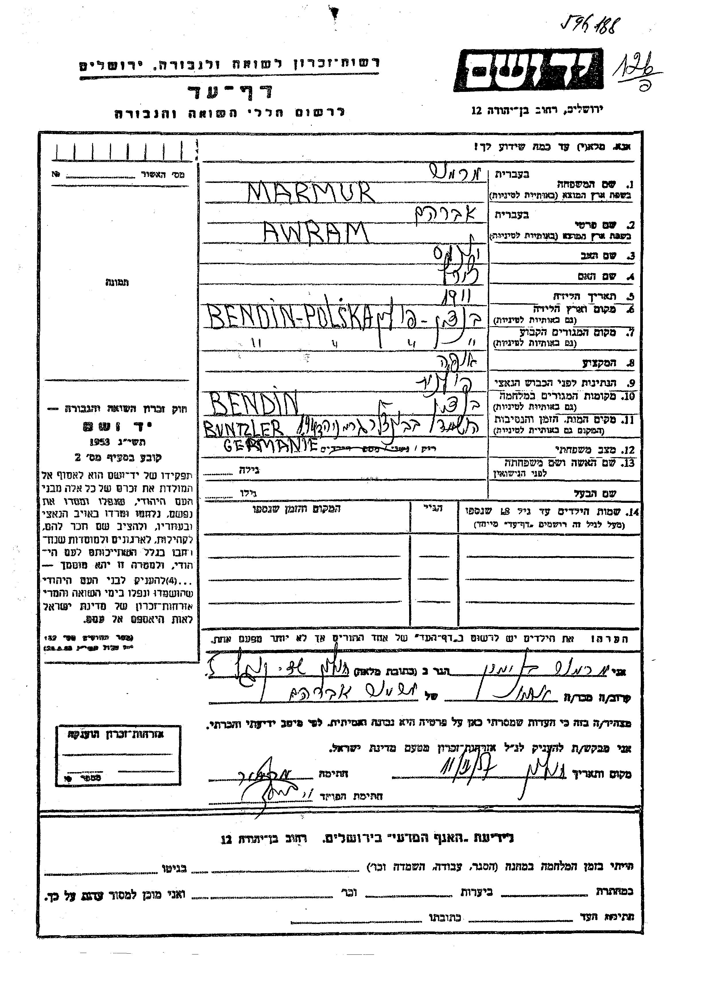 Мармур | Аврам | 1911 | Бендин, Польша | Лист свидетельских показаний |