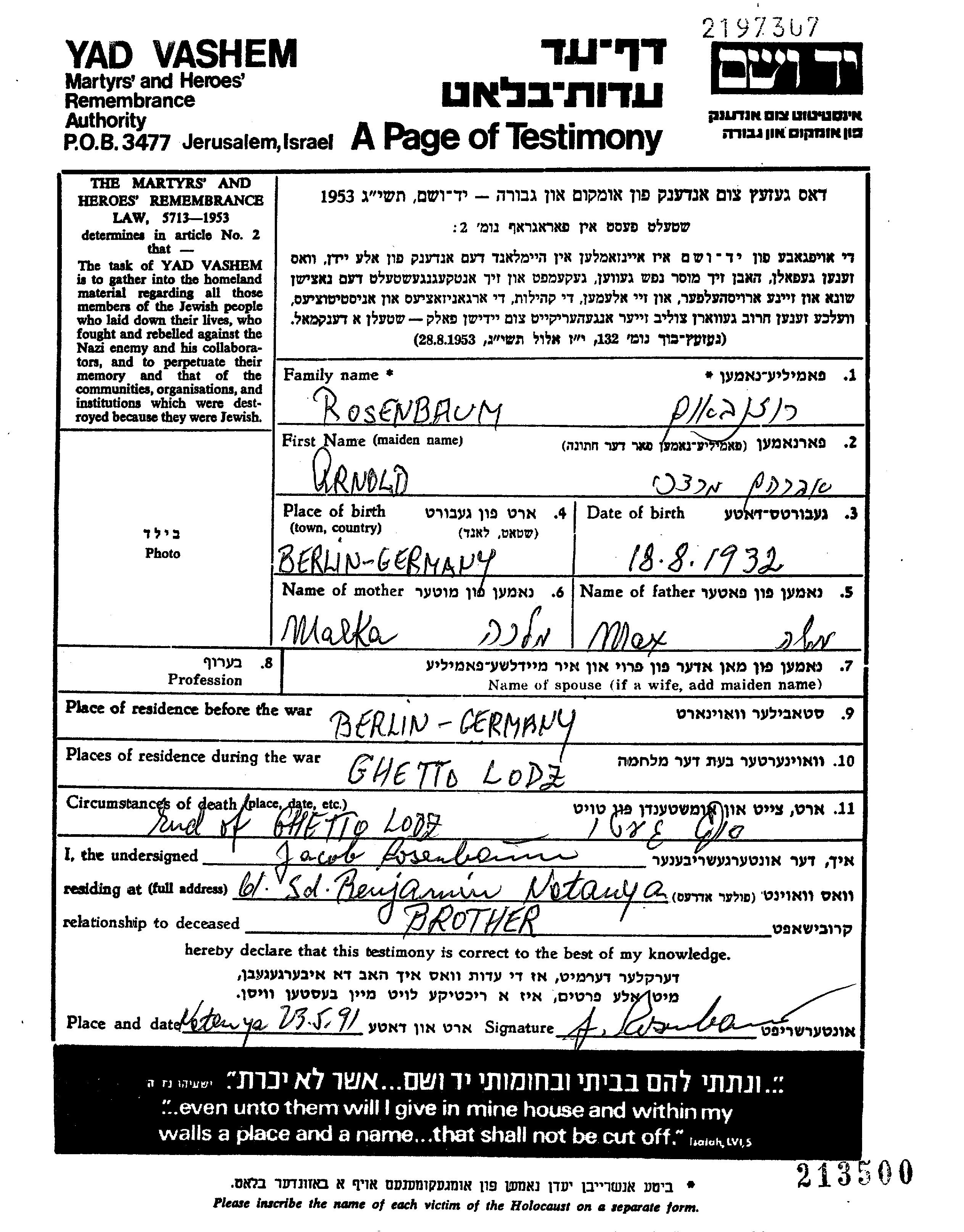 Авраам Арнольд Мордехай Розенбаум, место рождения: Берлин, Германия. Место жительства до войны: Берлин, Германия.