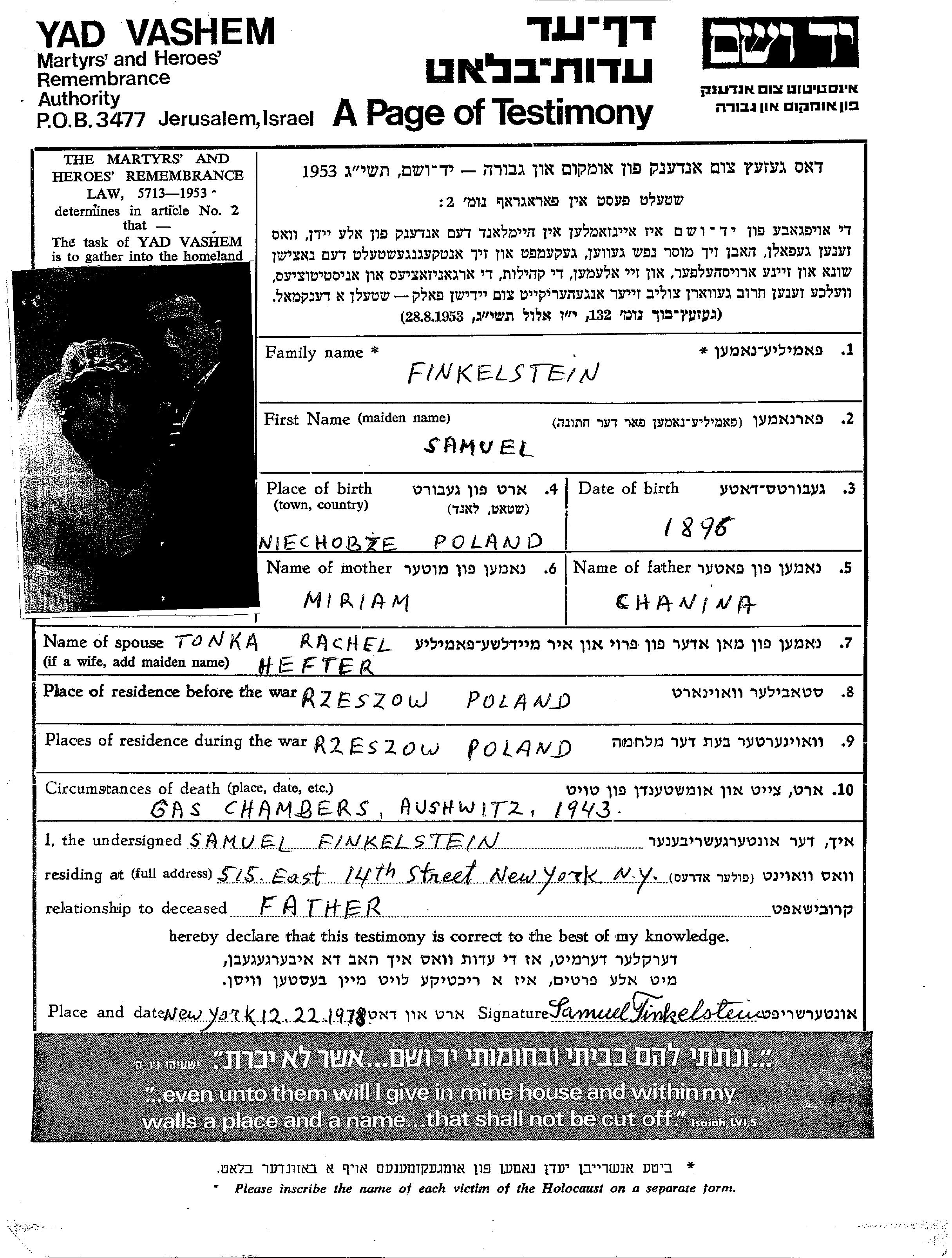 | Финкельштайн | Самуэль | 1896 | Жешув, Польша | Лист свидетельских показаний |