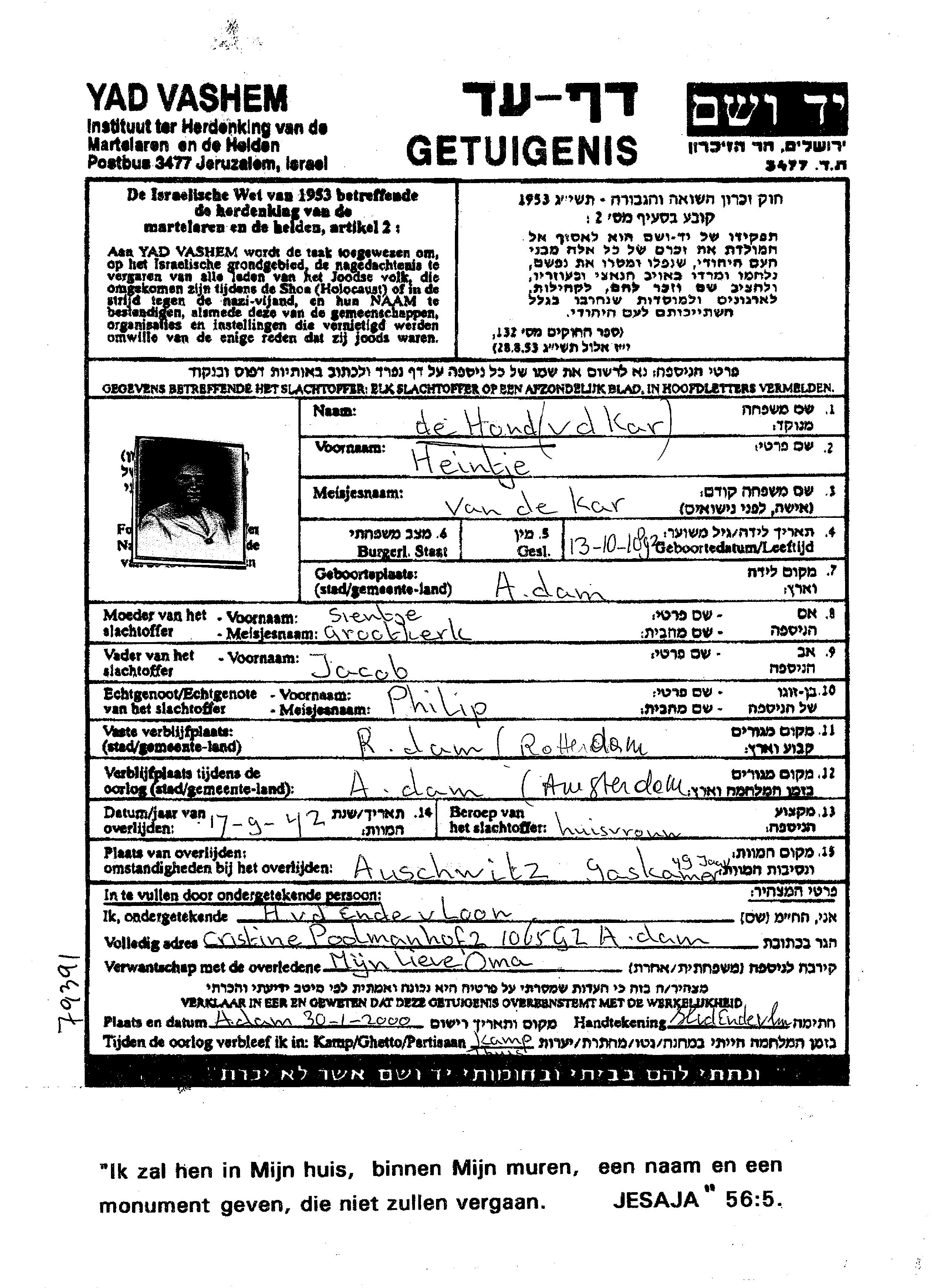 Хейнтье Хонд де, девичья фамилия Кар ван де, место рождения: Амстердам, Нидерланды. Домохозяйка. Место жительства до войны: Роттердам, Нидерланды.