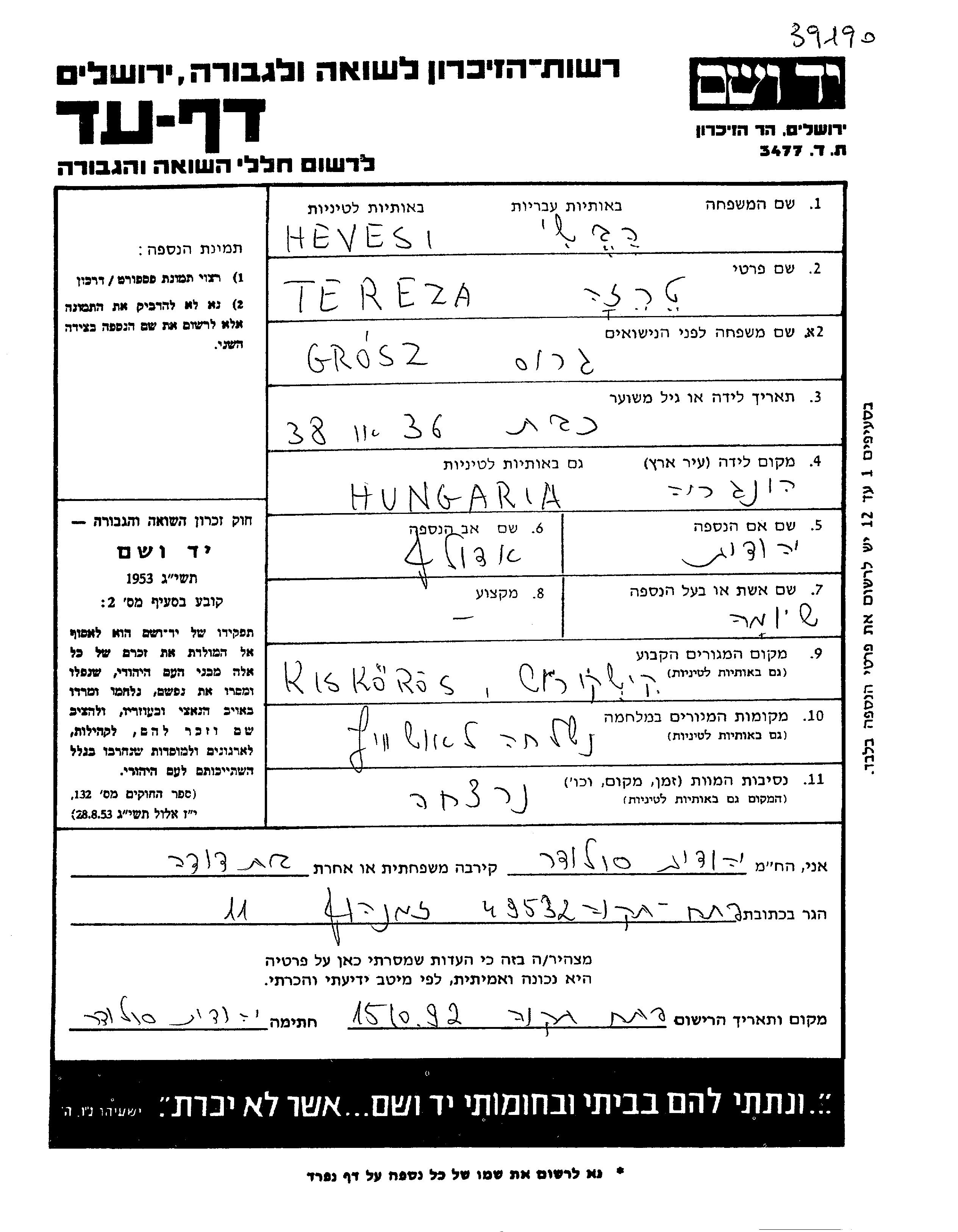 Хевеши Тереза 1908 Кишкёрёш, Венгрия Лист свидетельских показаний