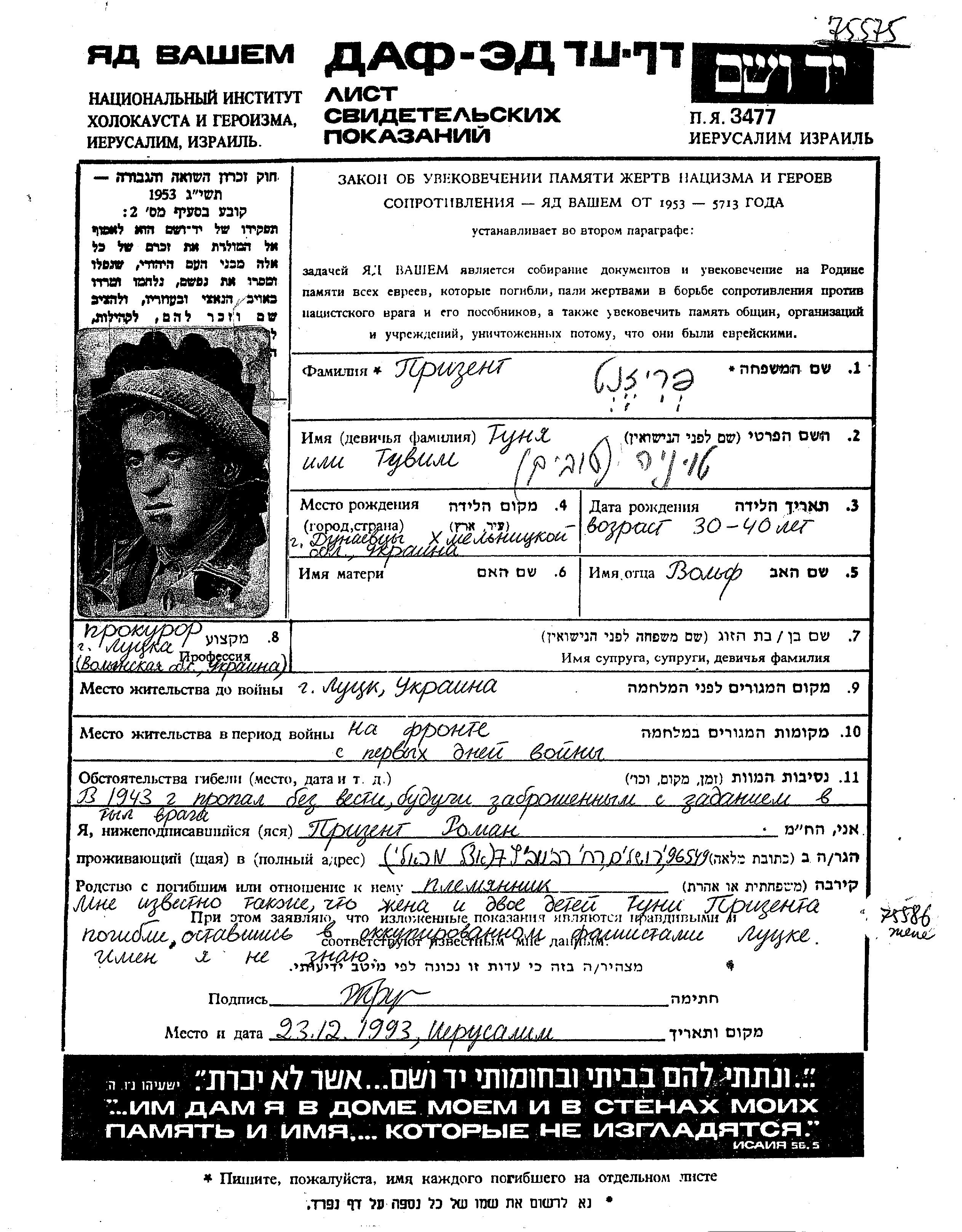 Тувия Туня Призент, место рождения: Дунаевцы, Украина (СССР). Место жительства до войны: Луцк, Польша.