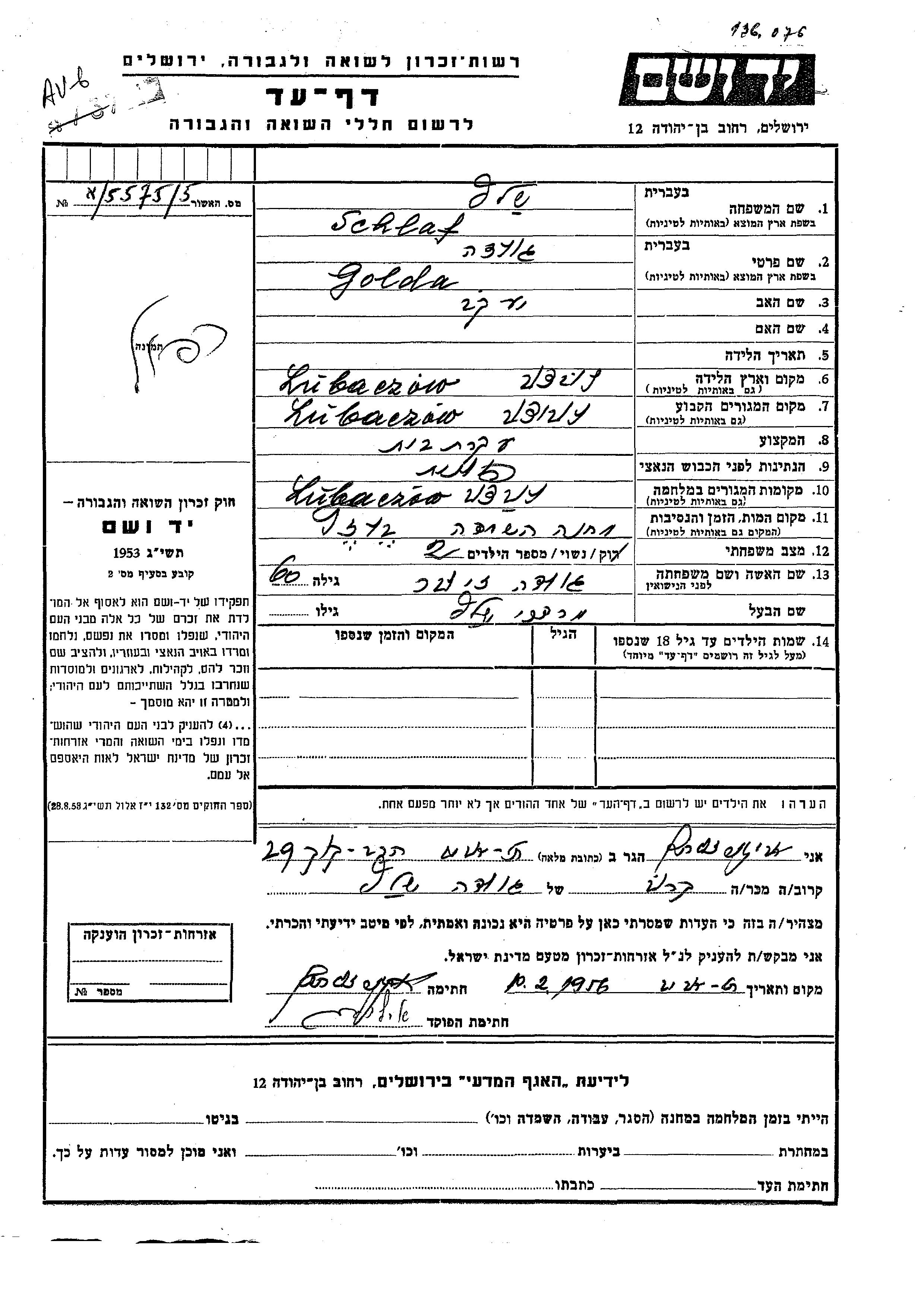 Голда Шлаф, девичья фамилия Зильбер, место рождения: Любачув, Польша. Домохозяйка. Место жительства до войны: Любачув, Польша.