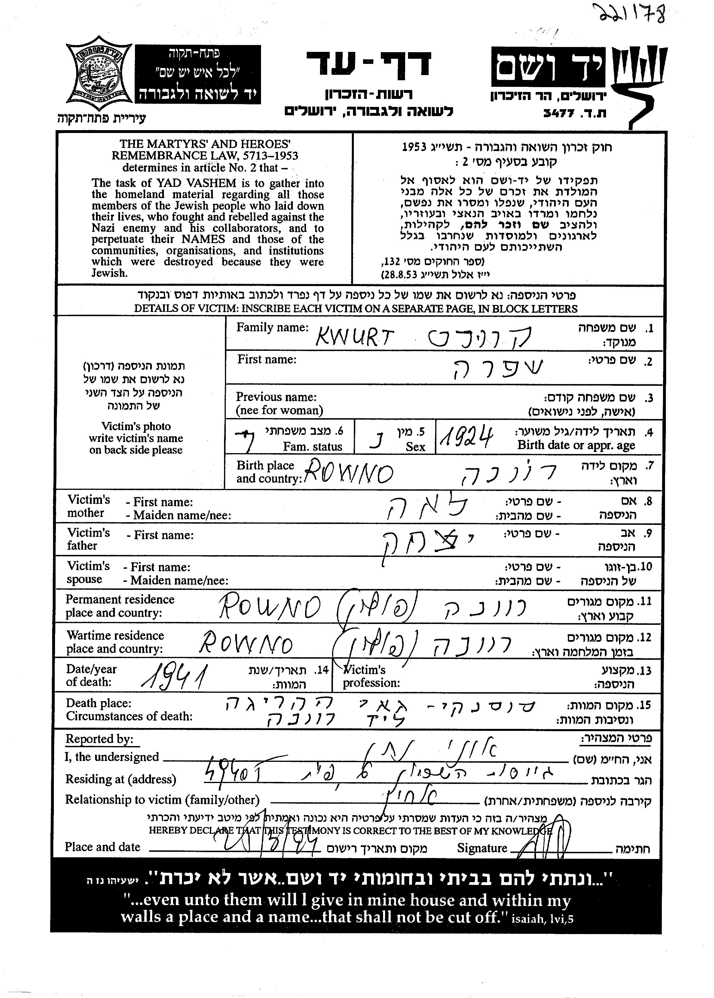 Шифра Квурт Кварт Каборт, место рождения: Ровно, Польша. Место жительства до войны: Ровно, Польша.