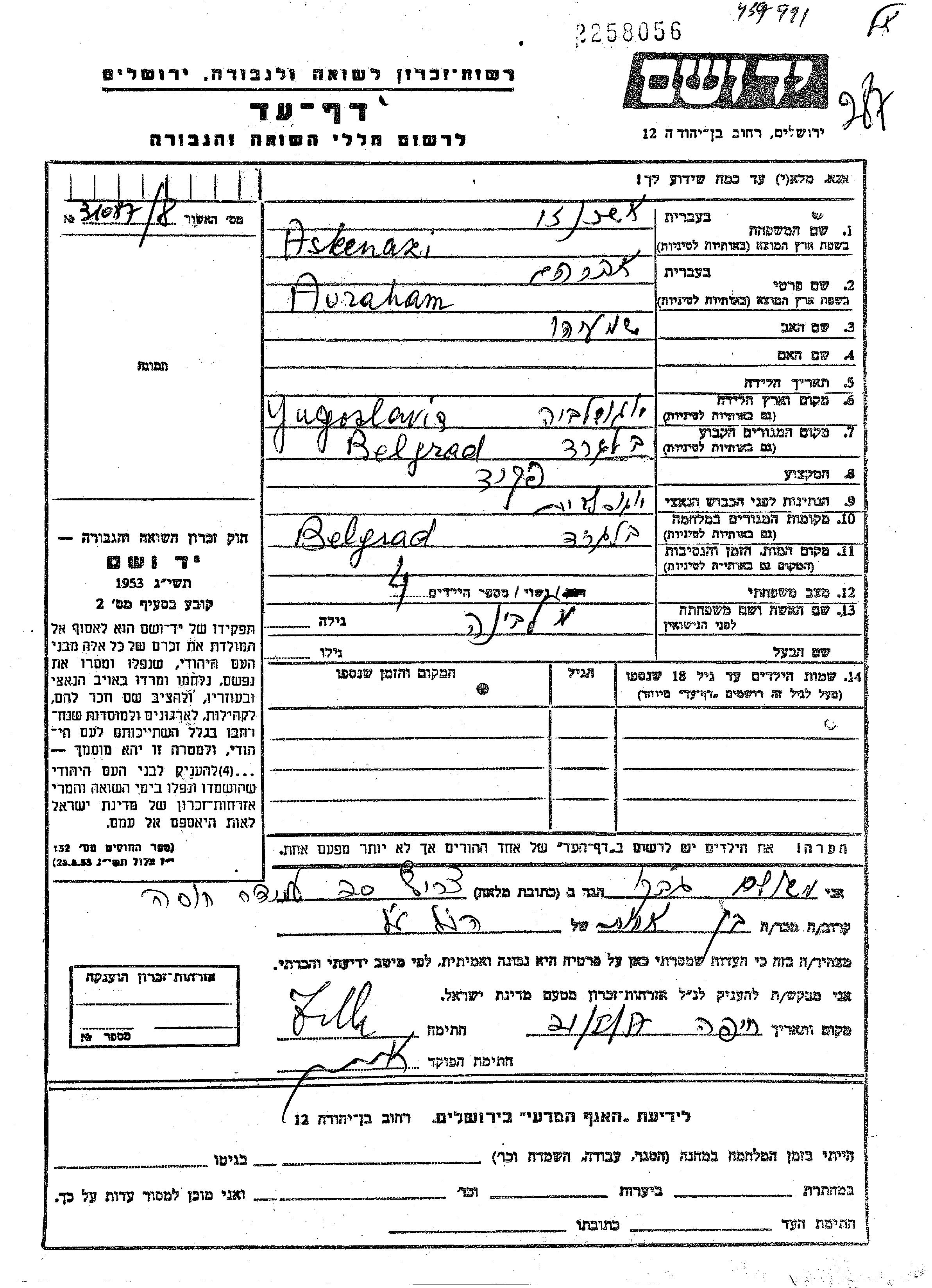 Ашкенази Авраам Белград, Югославия Лист свидетельских показаний