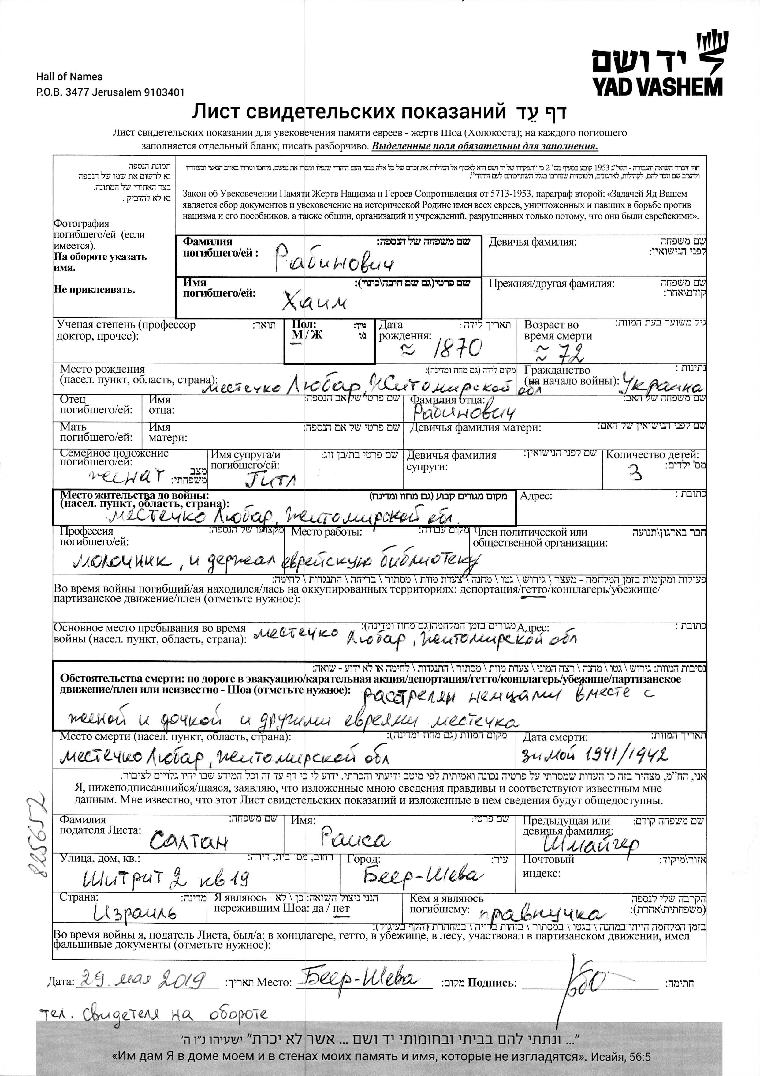 Рабинович Хаим 1870 Любар, Украина (СССР) Лист свидетельских показаний