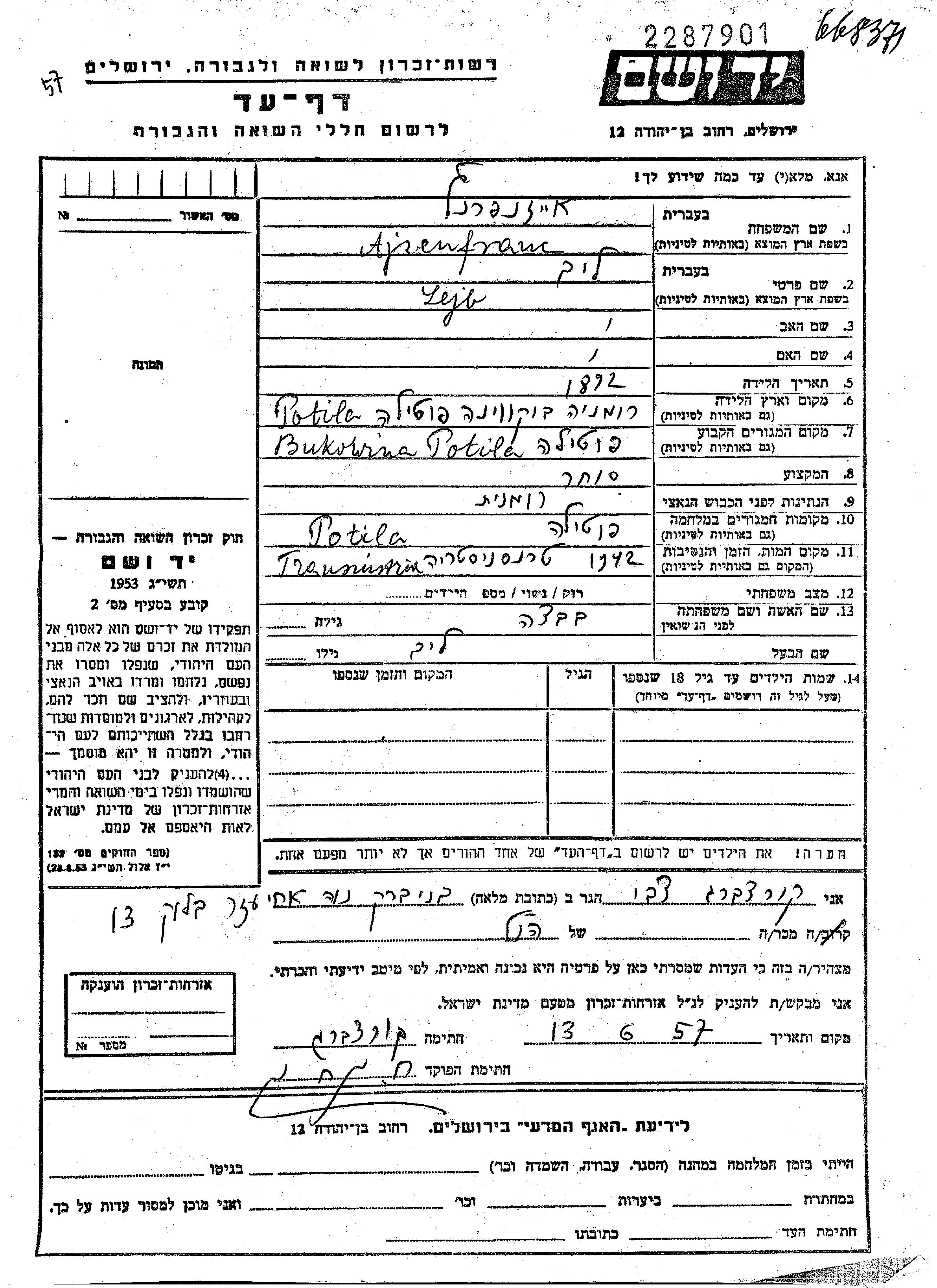 Айзенфранц Лейб 1892 Путила, Румыния Лист свидетельских показаний