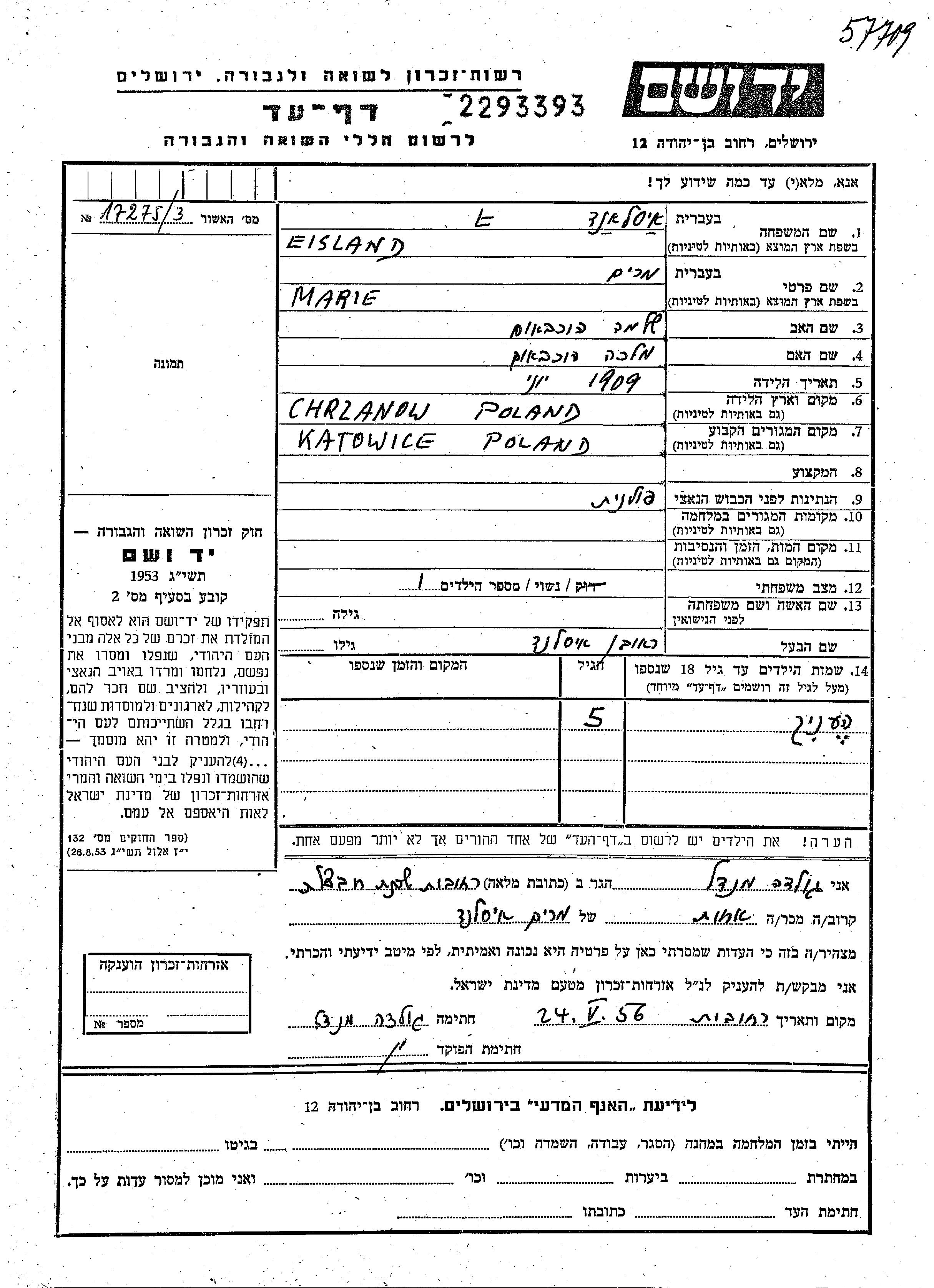 Эйсланд Мирьям Мария 1909 Катовице, Польша Лист свидетельских показаний