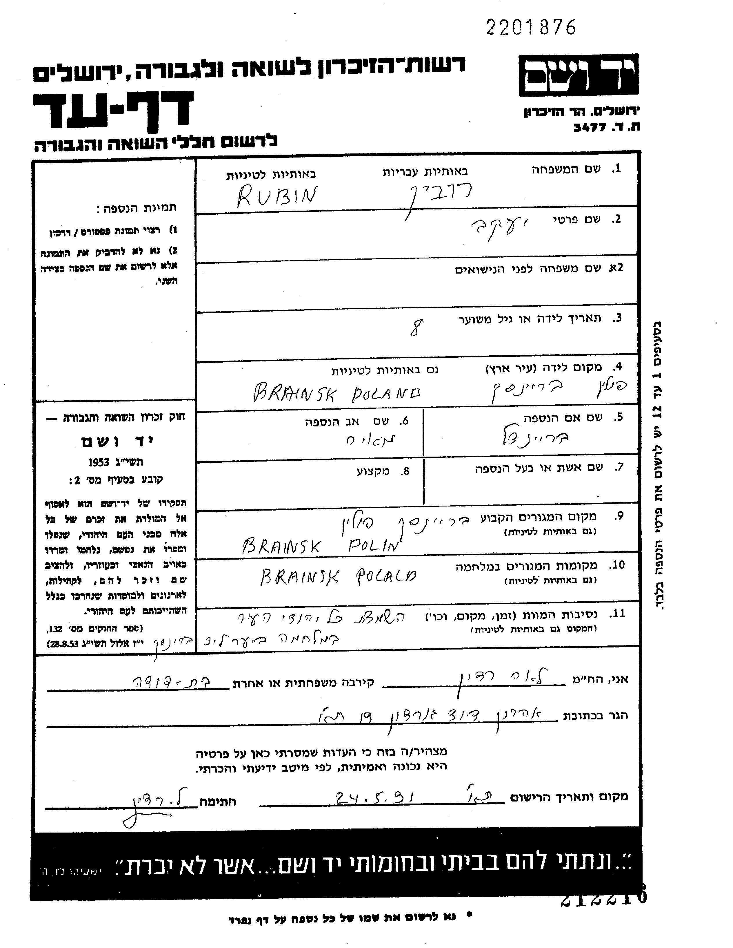 Яков Хенкеле Рубин, место рождения: Браньск, Польша. Место жительства до войны: Браньск, Польша.