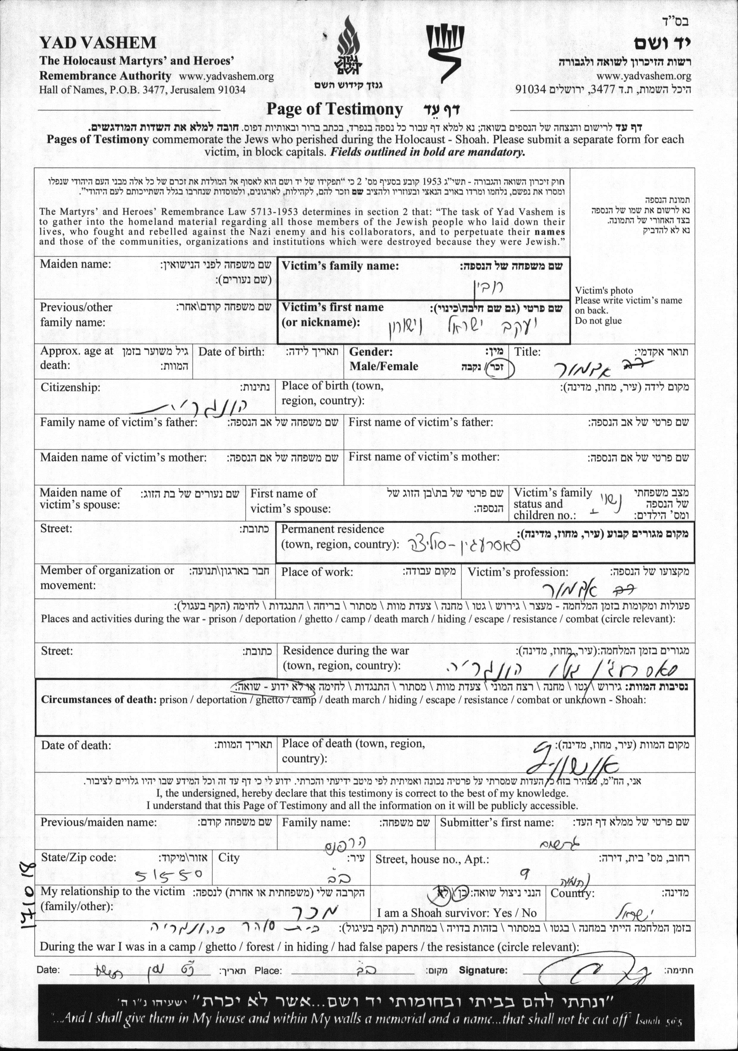 Яд Вашем - Листы свидетельских показаний Мемориального фонда