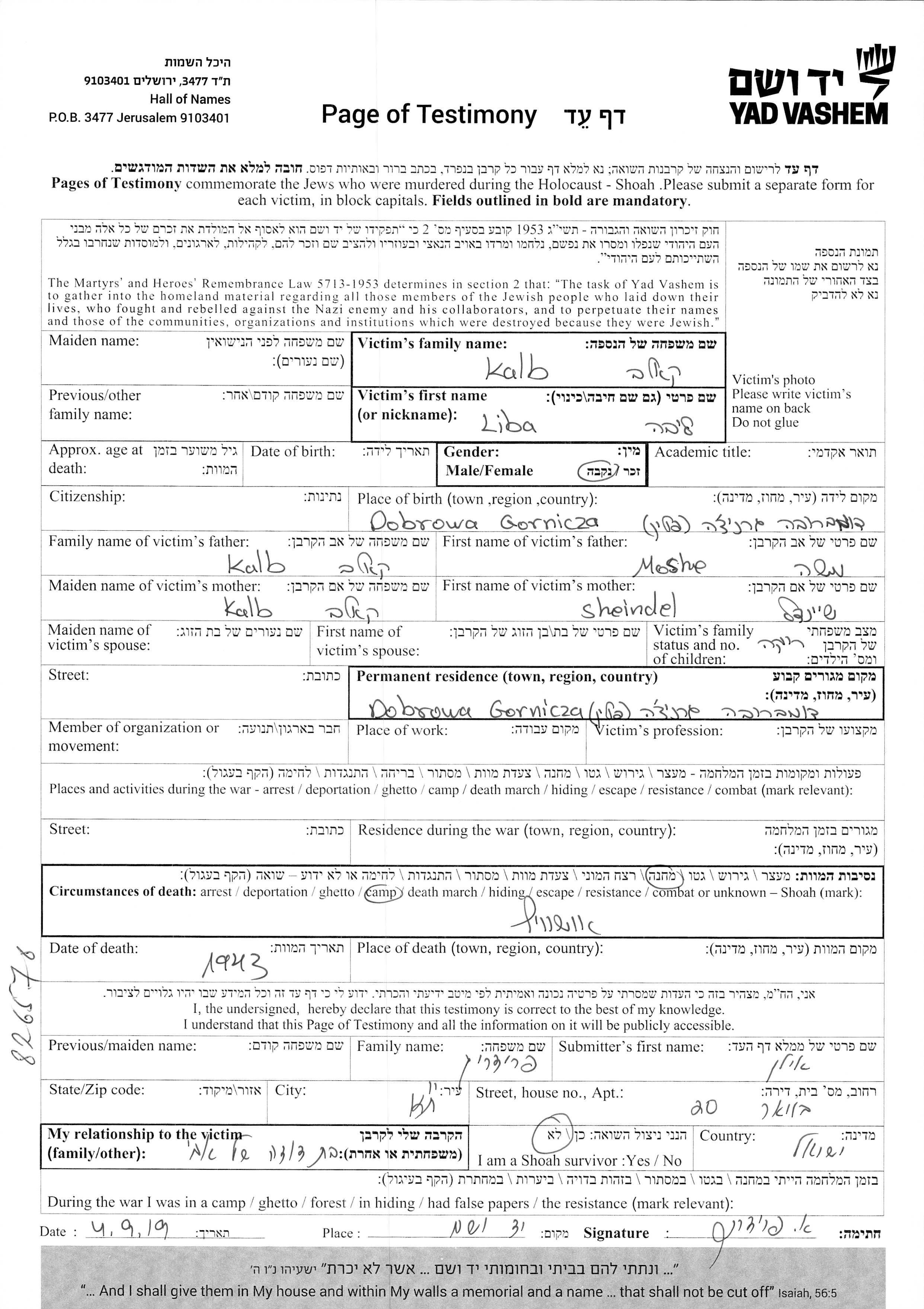 Либа Кальб, место рождения: Домброва-Гурнича, Польша. Отец: Моше, mать:Шейндел. Холост / не замужем. Место жительства до войны: Домброва-Гурнича, Польша.