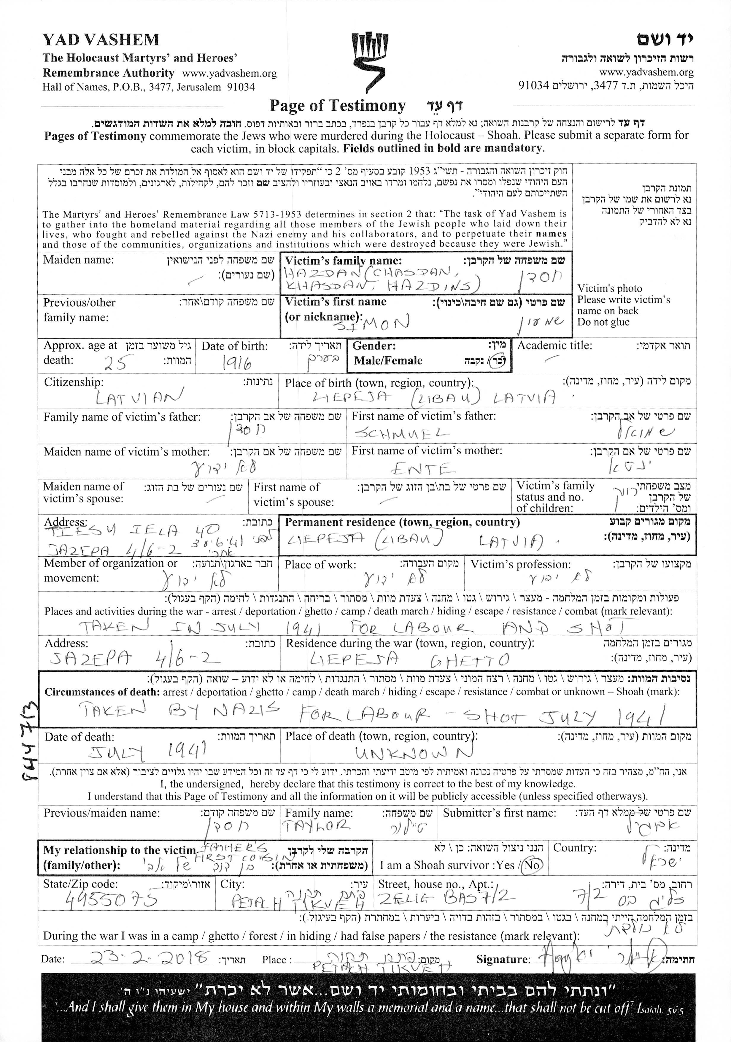 Хаздан Шимон 1916 Лиепая, Латвия Лист свидетельских показаний