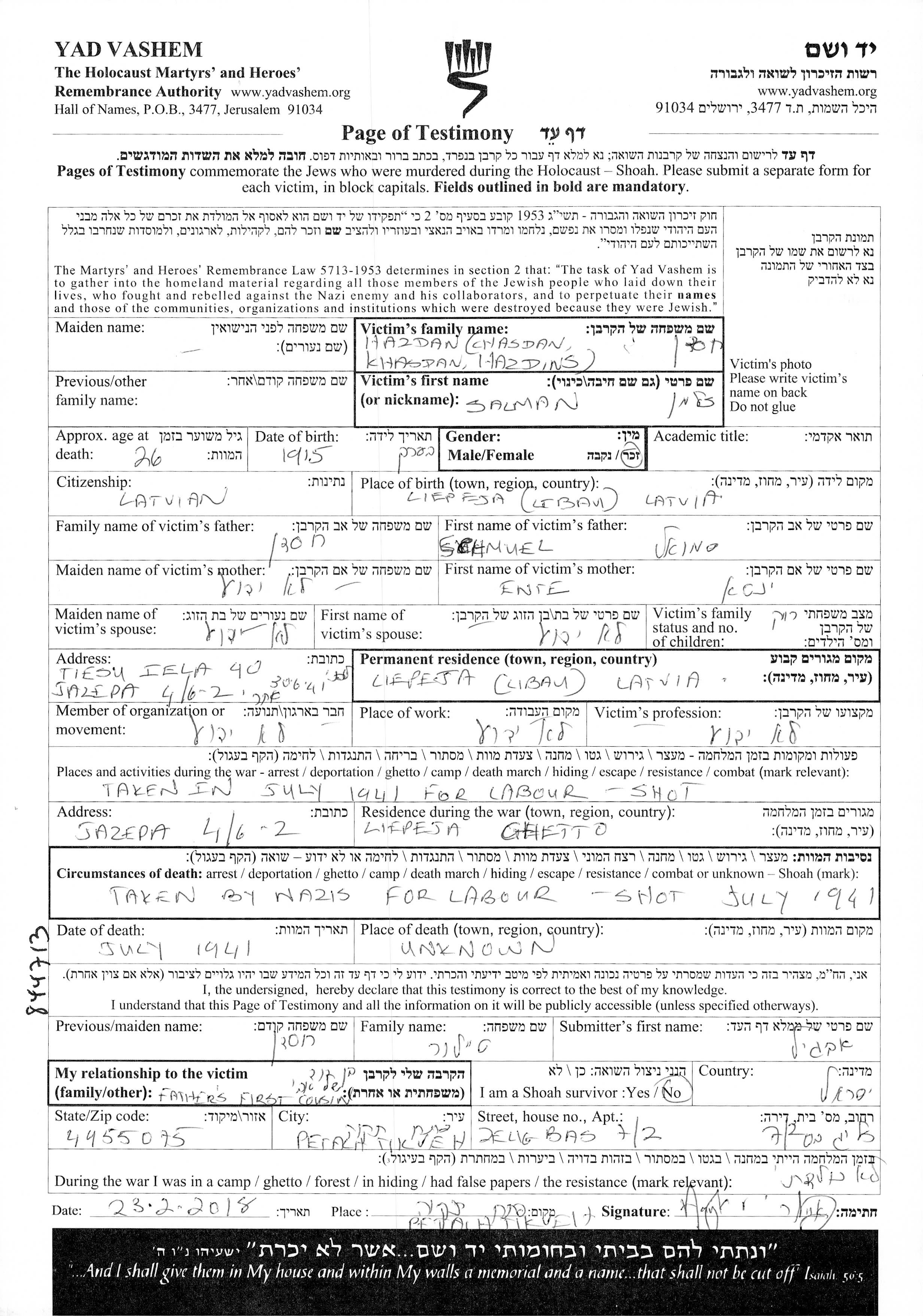 Хаздан Зальман 1915 Лиепая, Латвия Лист свидетельских показаний