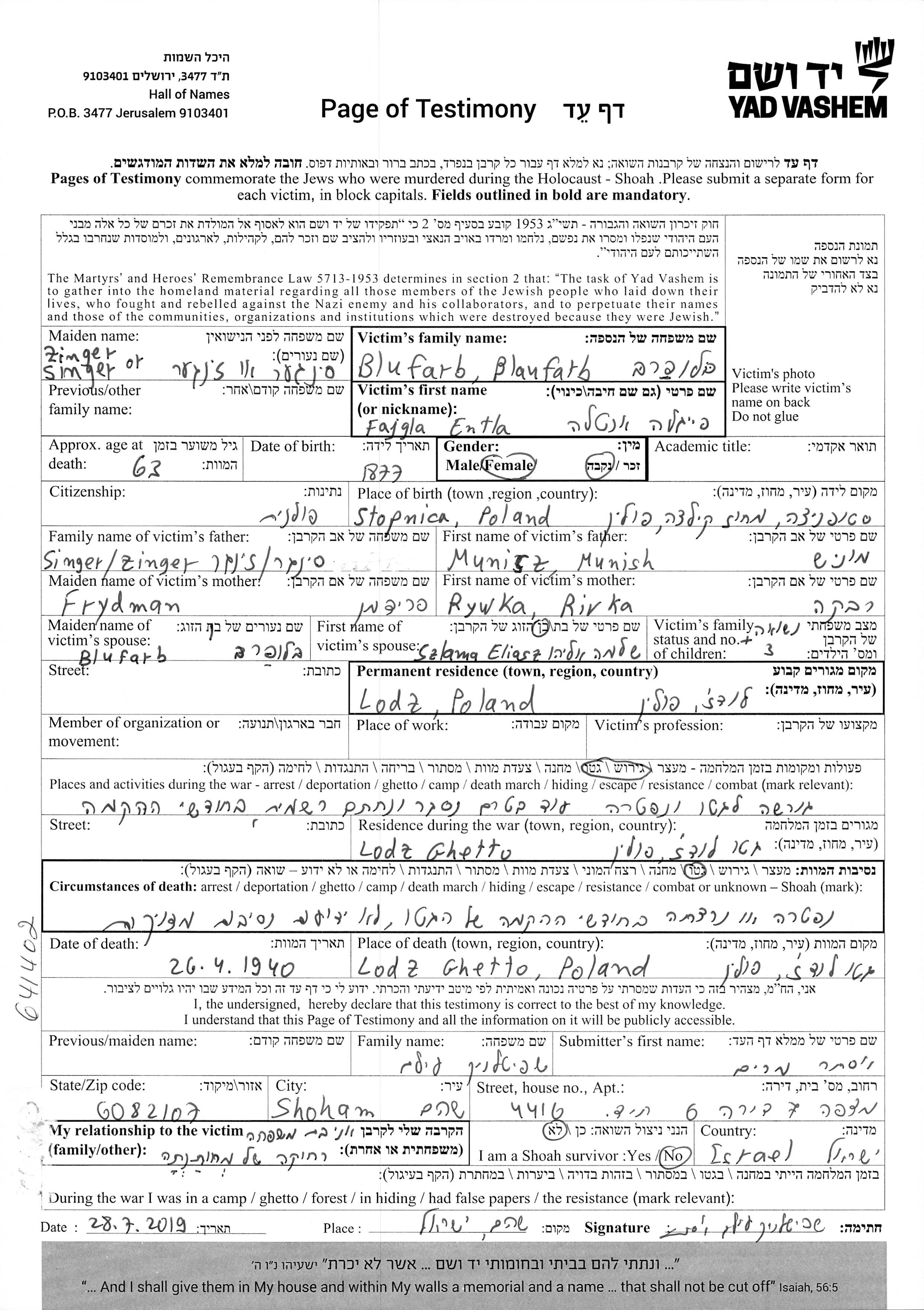Файгла Энтла Блюфарб, девичья фамилия Зингер, место рождения: Стопница, Польша. Отец: Муниш, mать:Рывка, девичья фамилия Фридман. Женат / замужем. Место жительства до войны: Лодзь, Польша. Место во время войны: Лодзь, Польша.
