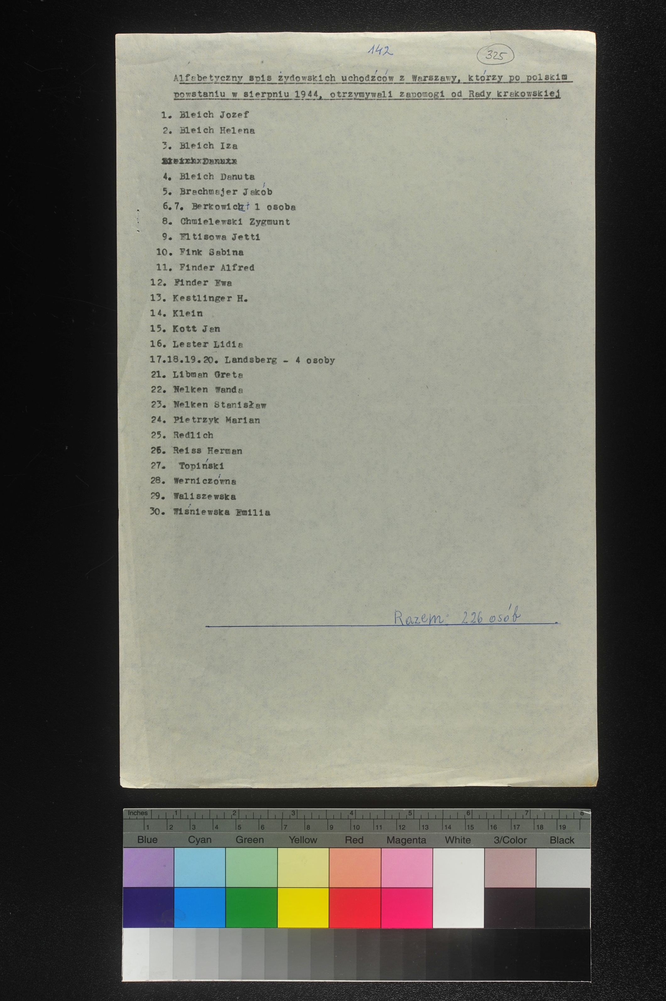 Alphabetical list of Jewish refugees from Warsaw who received help from the Jewish Relief Council (RPO) in Krakow after the Warsaw Polish Uprising, August 1944