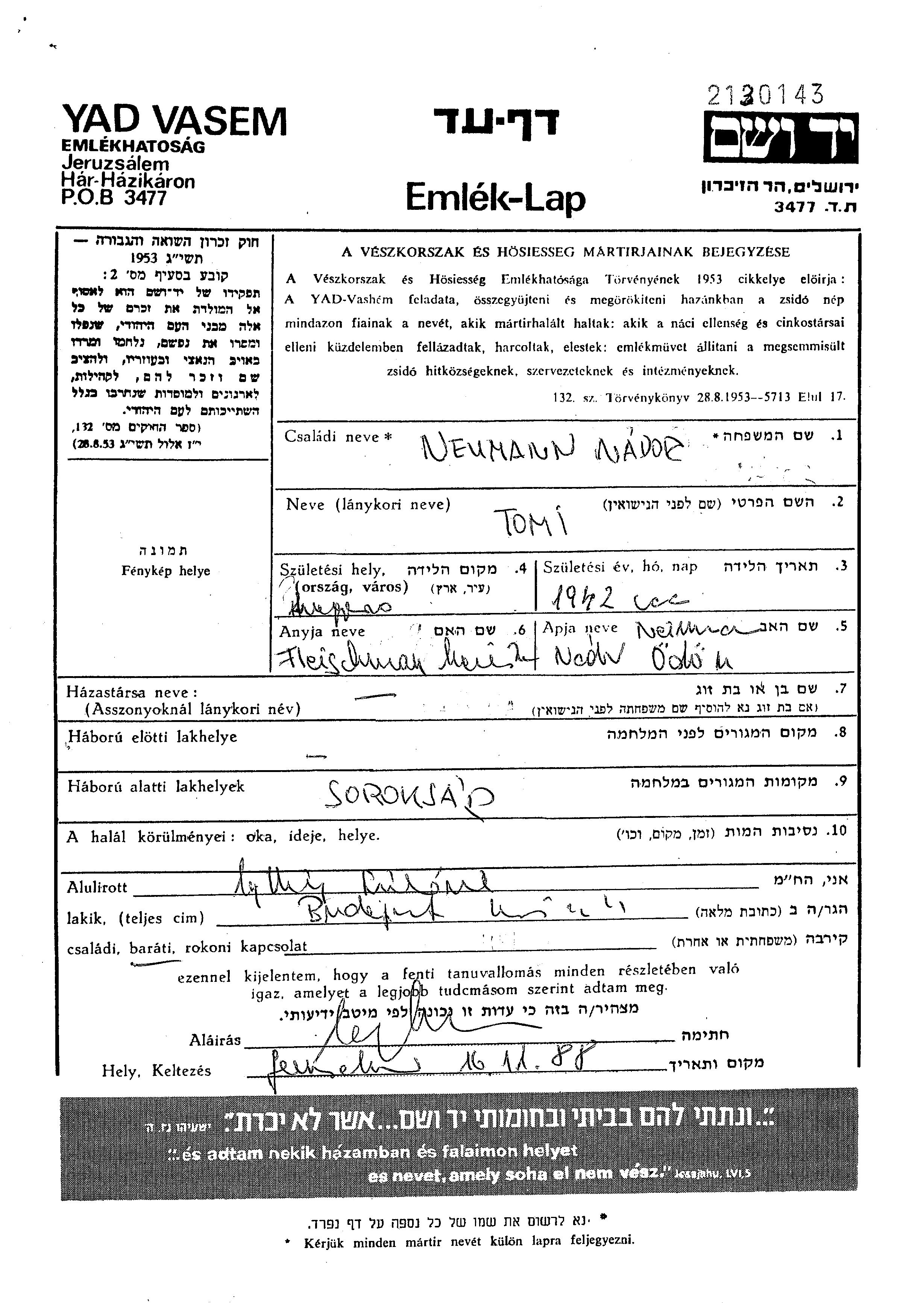 Томи Нойманн Надор, место рождения: Венгрия. Место жительства до войны: Шорокшар, Венгрия.