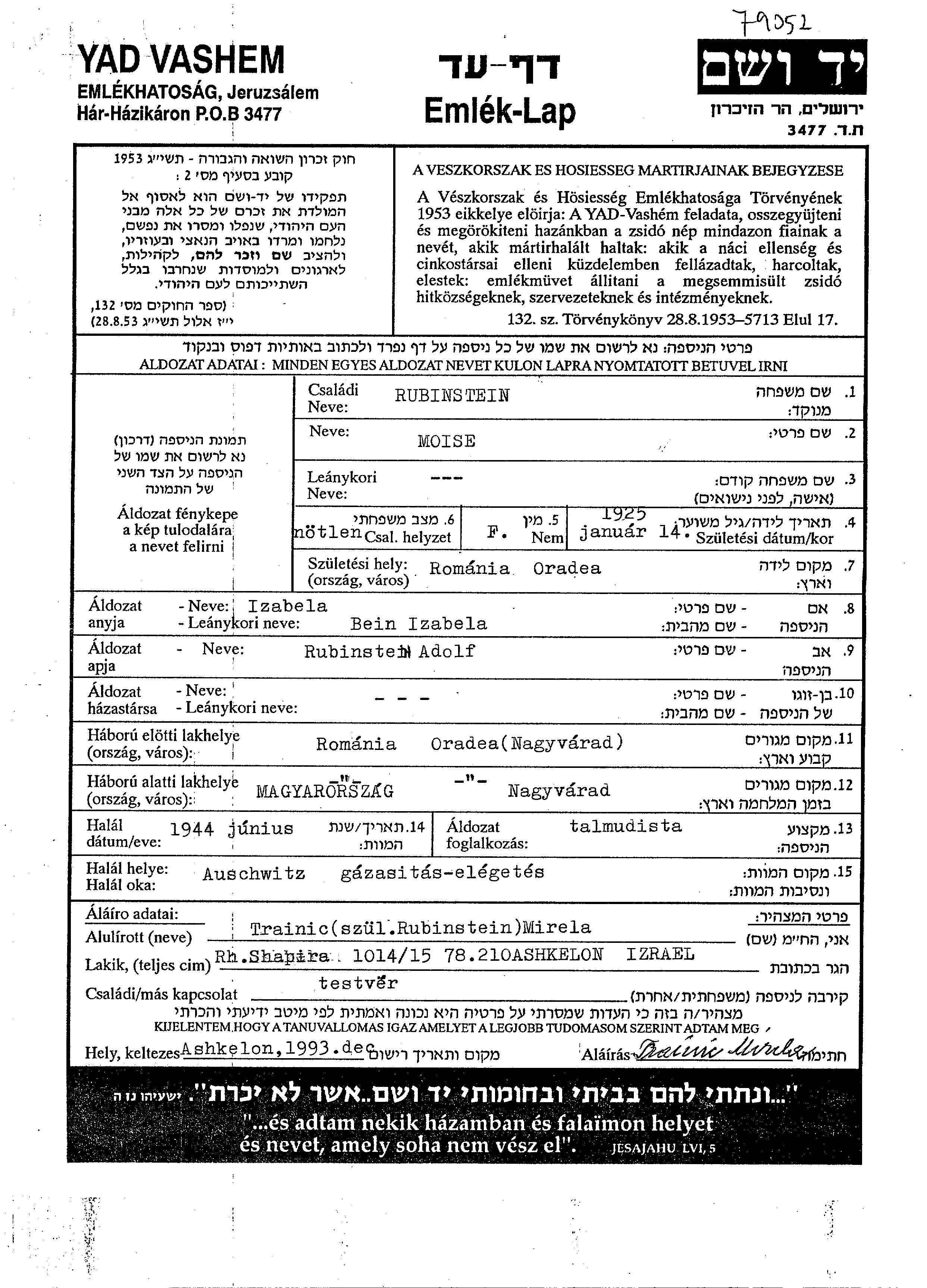 Рубинштайн Мойсе 1925 Надьварад, Румыния Лист свидетельских показаний