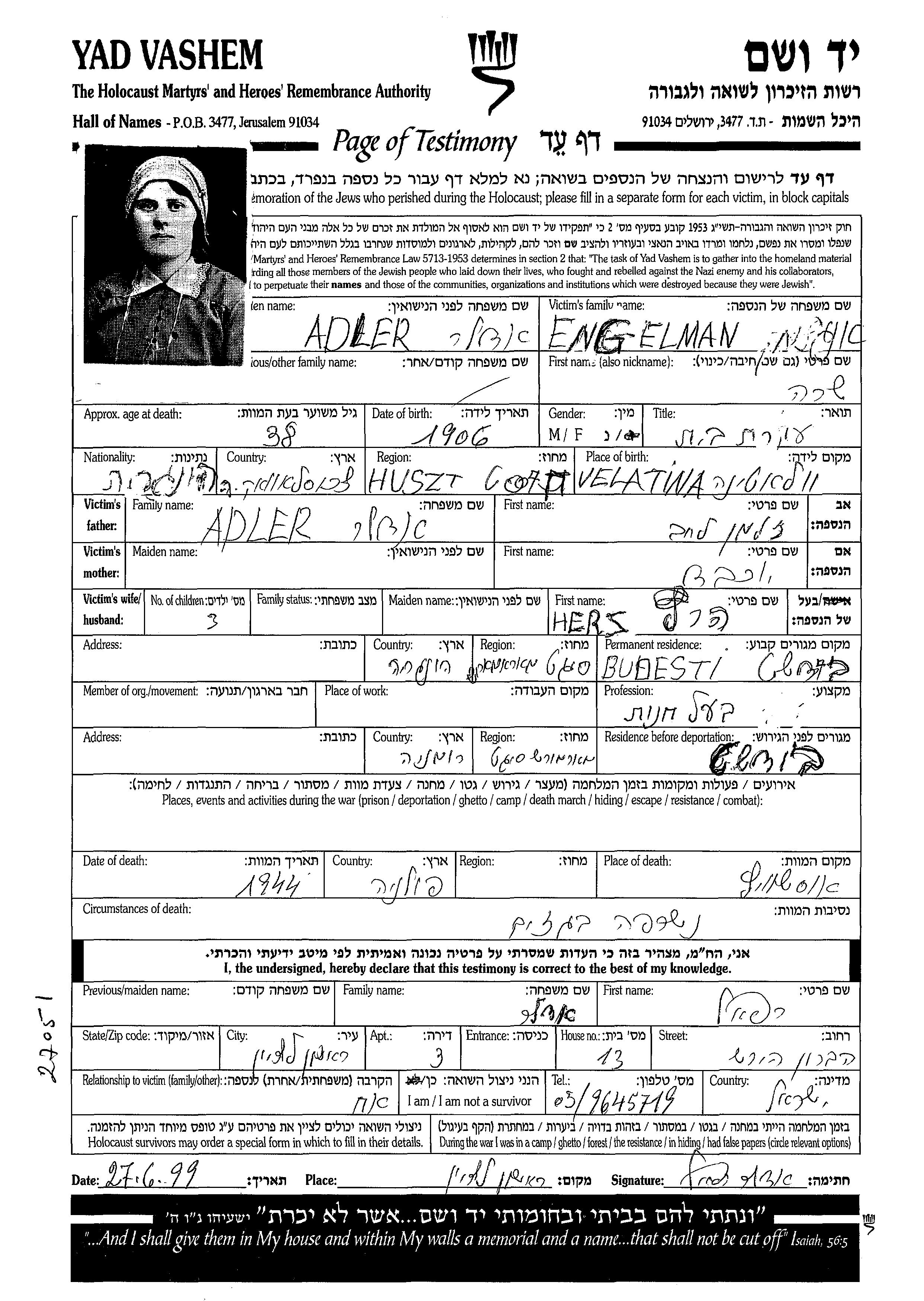 | Энгельман Адлер | Сари | 1908 | Велятин, Чехословакия | Лист свидетельских показаний |