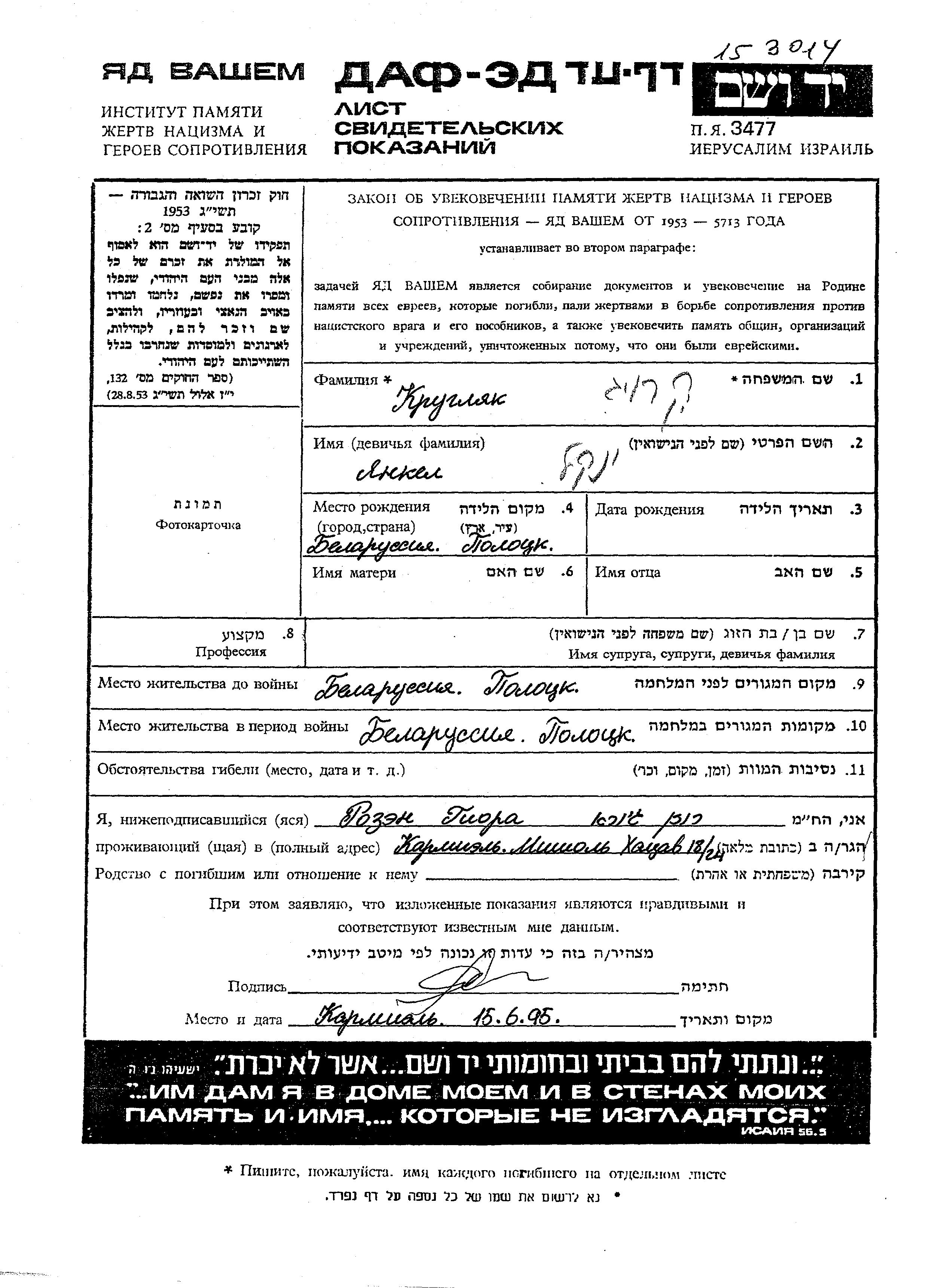 Кругляк Янкель Полоцк, Белоруссия (СССР) Лист свидетельских показаний