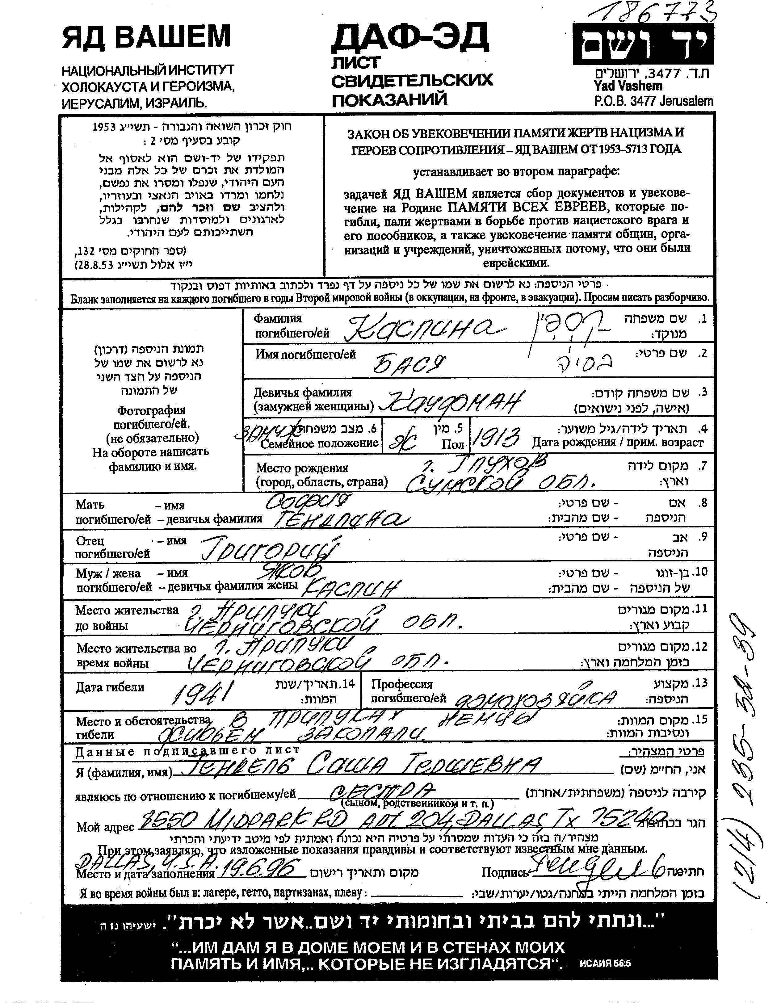 Каспин Бася 1913 Прилуки, Украина (СССР) Лист свидетельских показаний