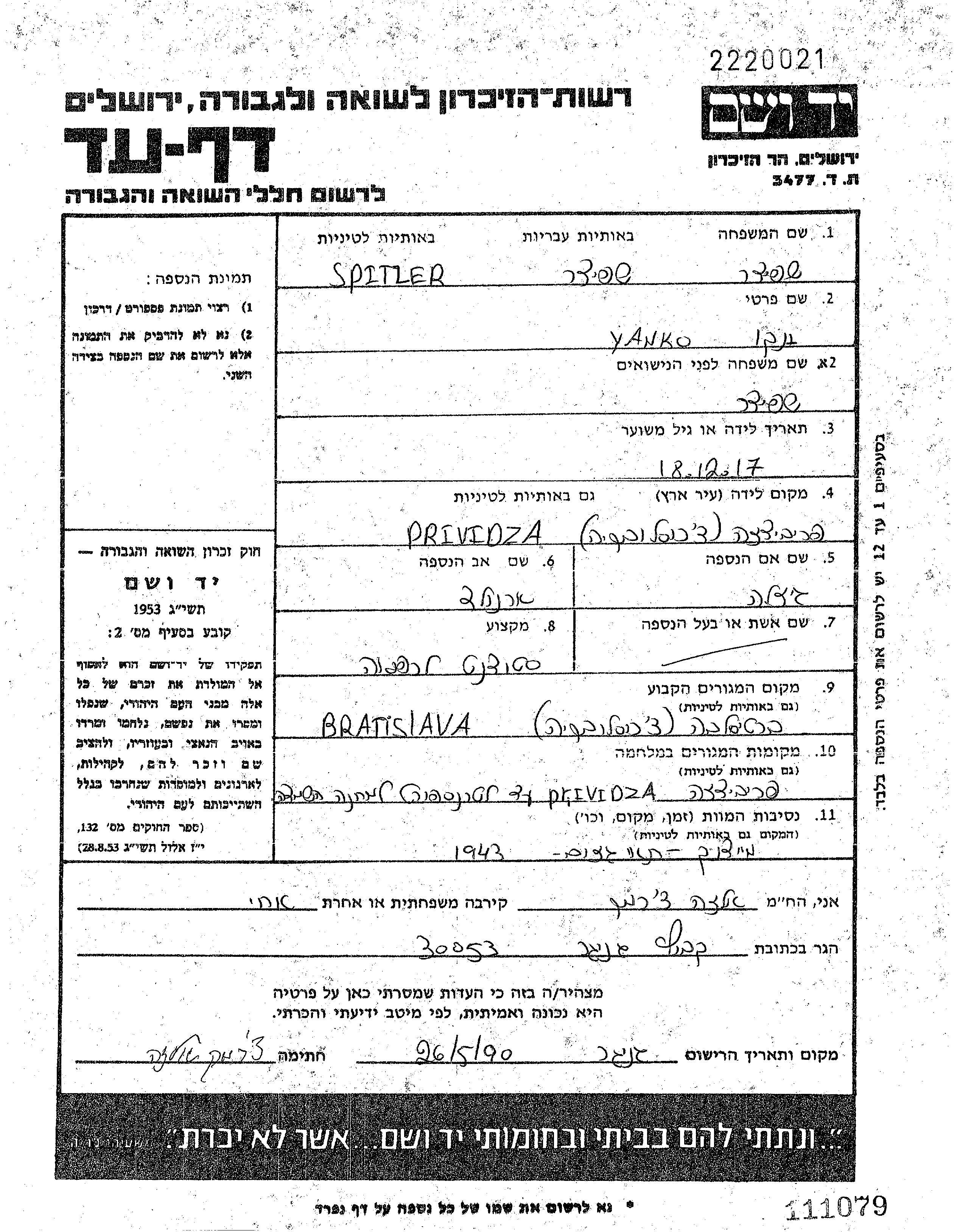 Шпицер Янко 1917 Братислава, Чехословакия Лист свидетельских показаний