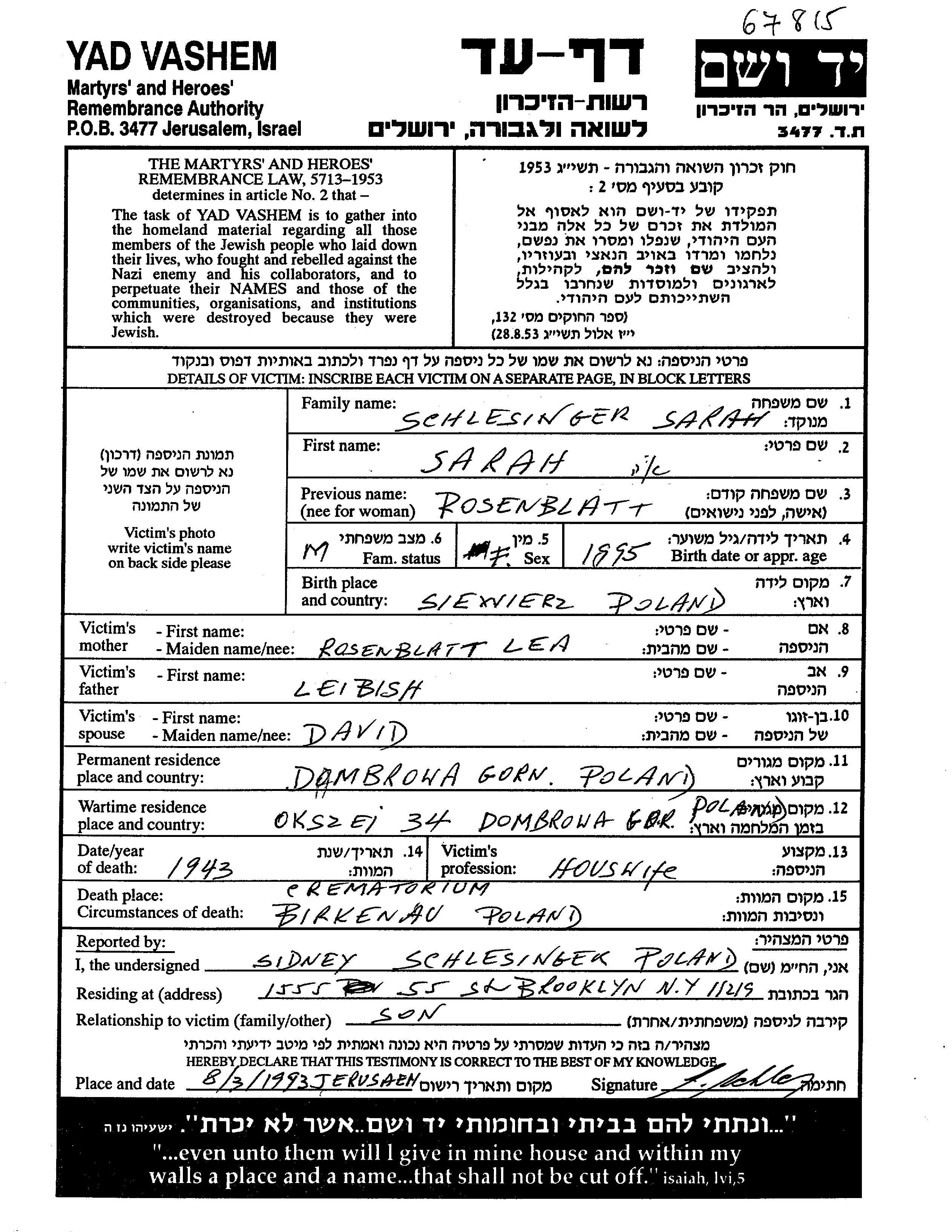 Шлезингер | Сара | 1895 | Домброва-Гурнича, Польша | Лист свидетельских показаний |