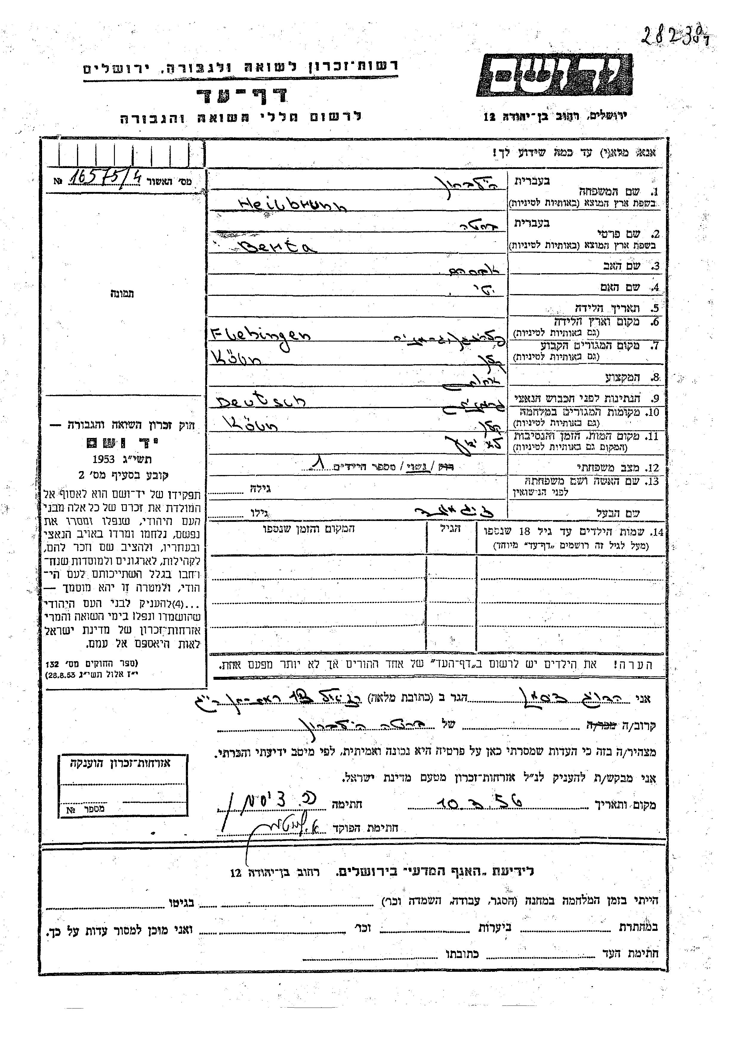 Хейльбрунн Берта Кёльн, Германия Лист свидетельских показаний