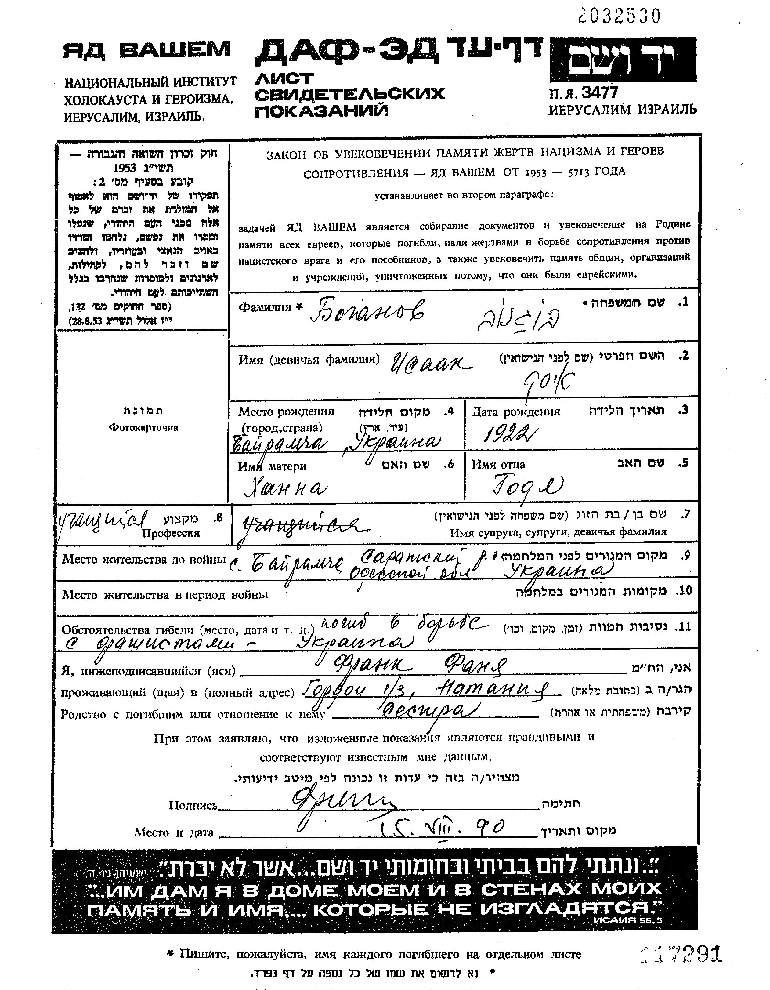 Боганов Исаак 1922 Байрамча, Румыния Лист свидетельских показаний